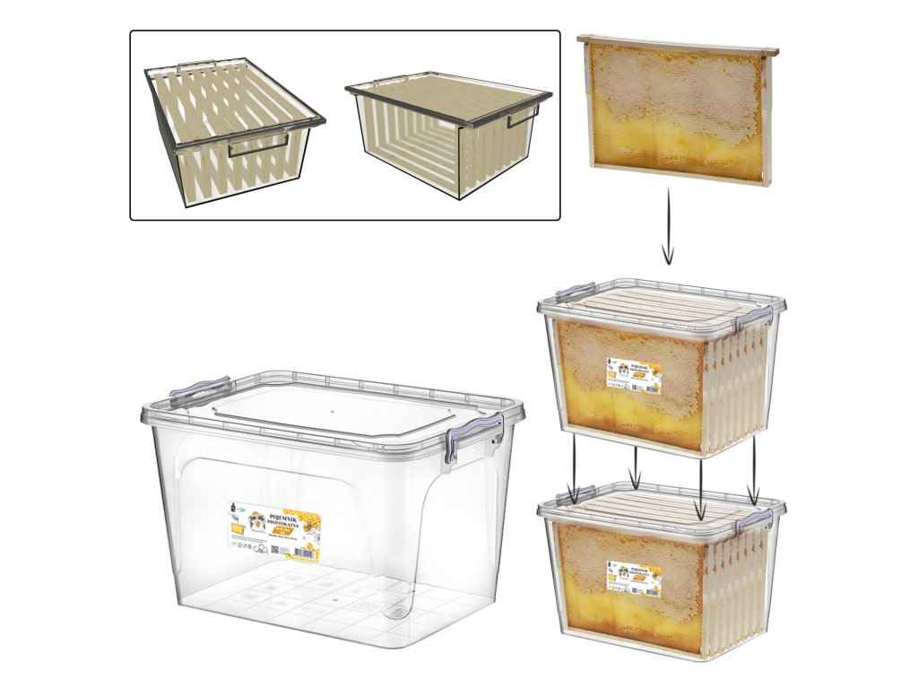 Nádoba vyrobená z vysokokvalitných materiálov. Je vybavená špeciálnymi výstuhami, vďaka ktorým sa plásty medu nedotýkajú nádoby. Navrhnutá bola na uskladnenie rámikov aj počas zimnej sezóny. Je vybavená dvoma bočnými držadlami uľahčujúcimi prenášanie a jej priehľadný povrch umožňuje jednoduché skontrolovanie obsahu. Nádoba môže pojať až 8 rámikov a tesný kryt zabraňuje prenikaniu mory a hlodavcov. Nádoby sa dajú skladať na seba, čím šetríme veľa priestoru.Špecifikácia