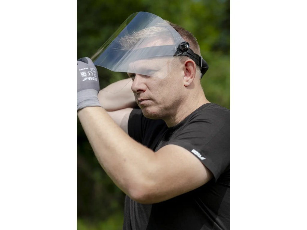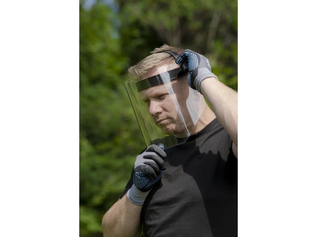 Zorník je vyrobený z odolného 1 mm hrubého polykarbonátu. Dĺžka clony je 24 cm, takžechráni celú tvár. Pohodlný ovládač na nastavenie obvodu umožní, aby clona dokonale sedela.