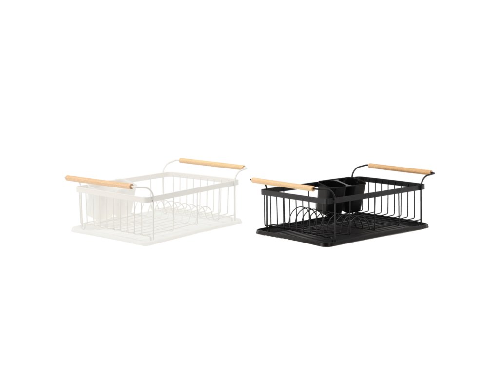Odkvapkávač na riad.Materiál: oceľový rám, rúčky z gumy, plastová tácka a držiak na príbor.