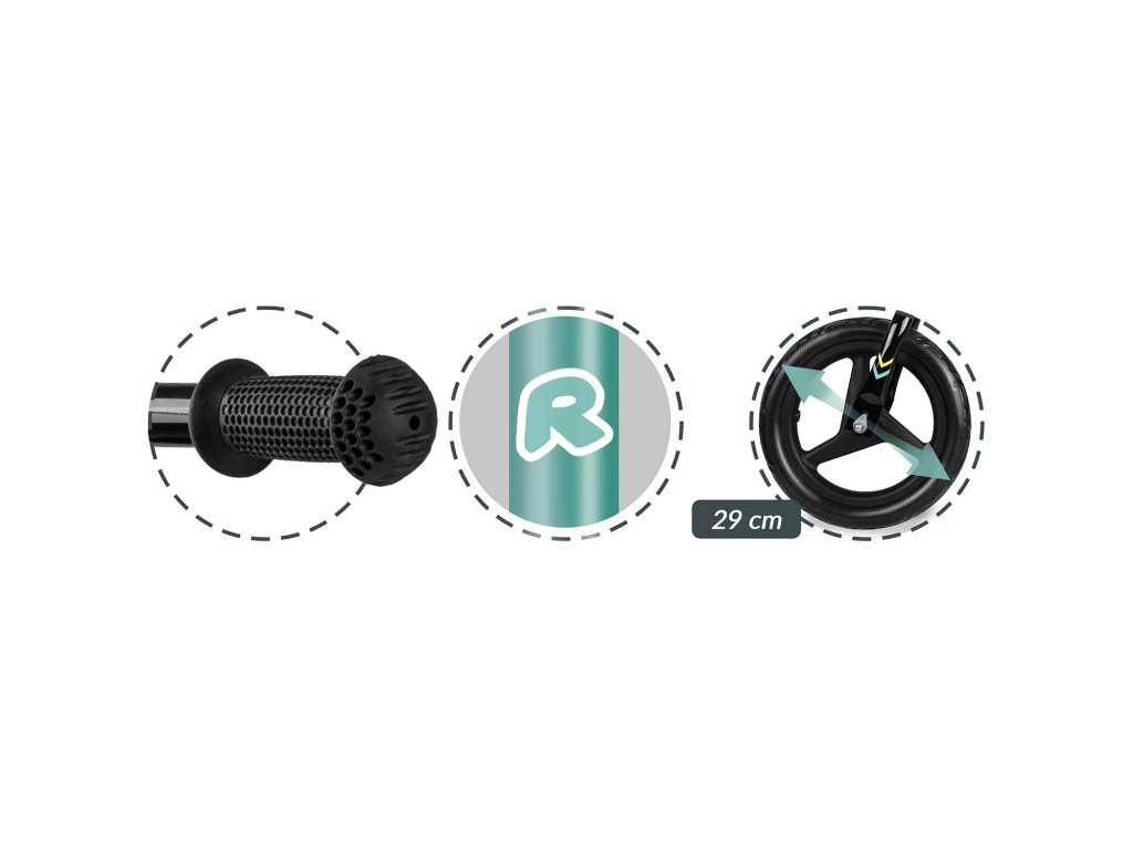 - Kolesá: veľké, robustné kolesá z EVA peny s odolnými pneumatikami zabezpečujúce stabilitu a plynulosť jazdy. Tichá prevádzka počas jazdy zaisťuje, že odrážadlo nie je rušivé pre uši ani pri jazde doma.