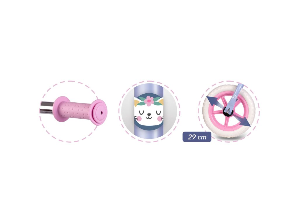 - Kolieska: veľké, pevné kolieska z EVA peny s odolnými pneumatikami, ktoré zabezpečujú stabilitu a plynulú jazdu. Tichý chod počas jazdy robí kolobežku neobťažujúcou pre uši dokonca aj pri jazde doma.