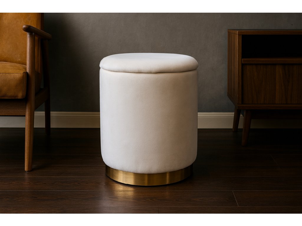 Elegantná krémová okrúhla taburetka so zlatým lemom – ideálna ako sedadlo, podnožka alebo štýlová dekorácia. Kompaktný rozmer 28x42 cm, nosnosť do 80 kg. Nadčasový dizajn do každého interiéru.