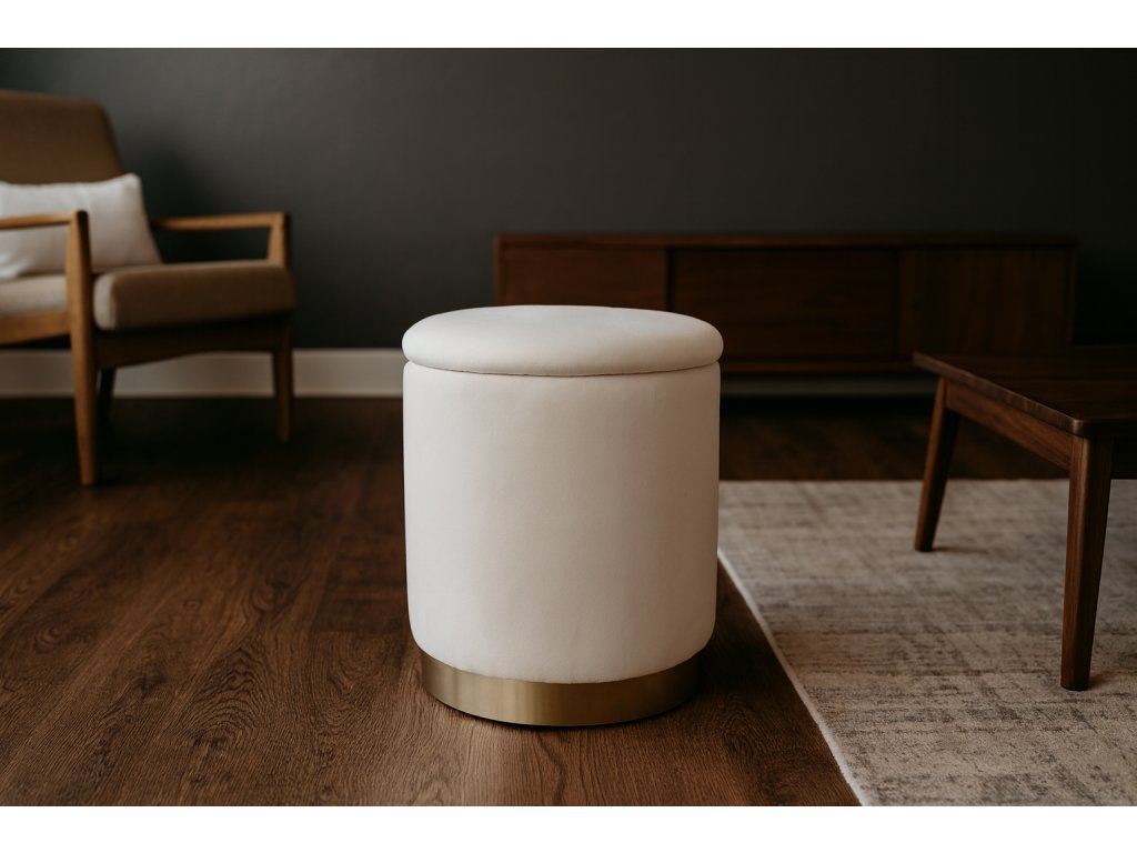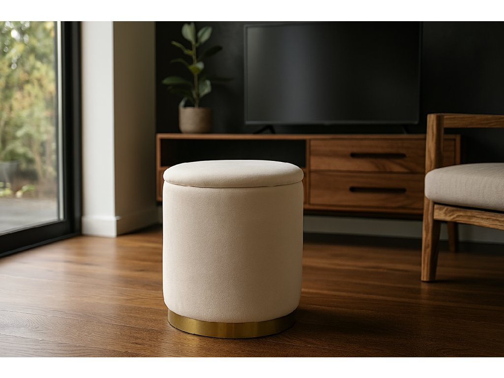 ?? Štýlová krémová pufa so zlatým lemom ? – malá, ale plná charakteru! Ideálna ako sedenie ??, podnožka ?? alebo dekorácia ??, vďaka kompaktným rozmerom ?? a vytrvalosti do 80 kg ??.