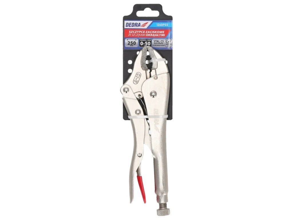 Krimpovacie kliešte s okrúhlymi čeľusťami, otvor čeľustí max. 50 mm, nastavovacia skrutka, dĺžka výrobku 250 mm, materiál tela uhlíková oceľ CS, čeľuste z CrV ocele, povrch poniklovanýDodatočné parametre