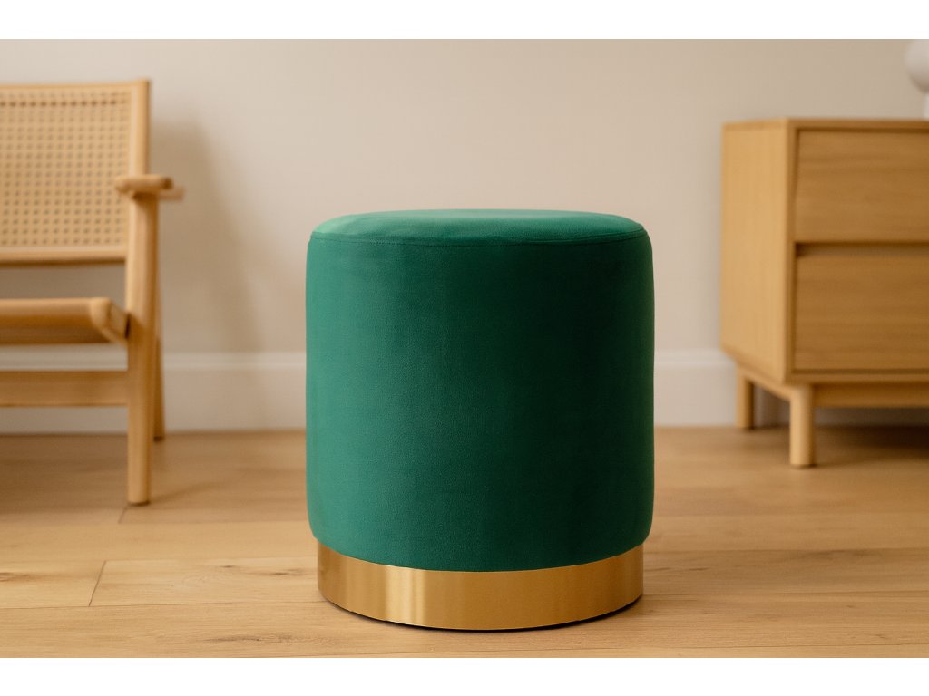 Velúrová pufa na zlatom podnožke 35x40 cm v tmavozelenej farbe je elegantný a funkčný kus nábytku do obývačky, spálne alebo predsiene. Poskytuje pohodlie, štýl a trvanlivosť, osvedčuje sa ako sedadlo, podnožka alebo dekoratívny akcent.