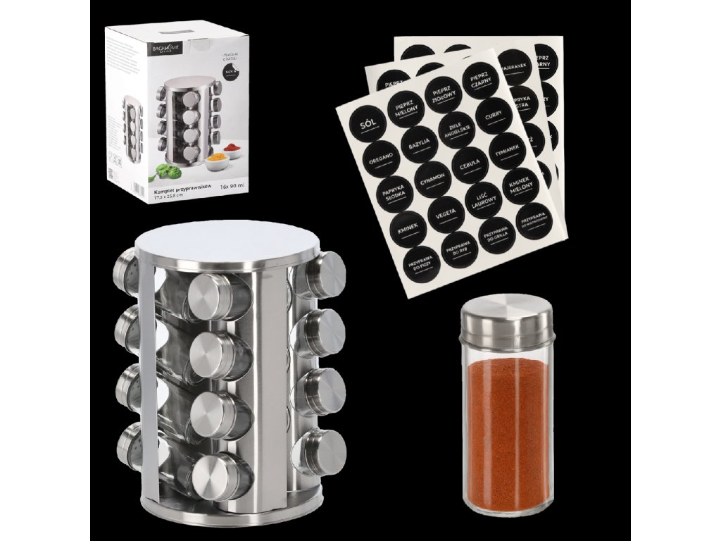Okrúhly otočný stojan na koreniny s priemerom 17,3 cm a výškou 25,8 cm, vyrobený z nehrdzavejúcej ocele. Zabezpečuje funkčné a estetické uskladnenie korenín v každej kuchyni.