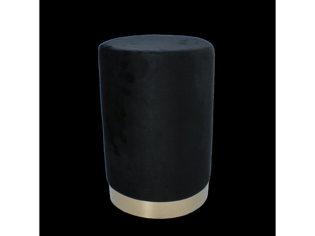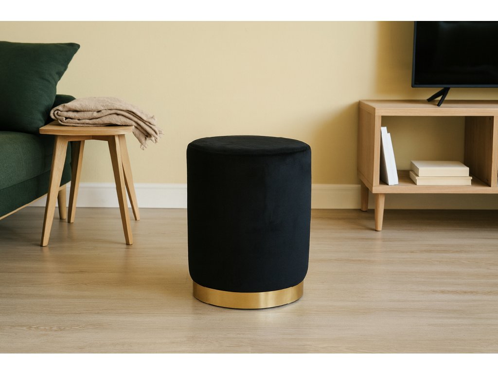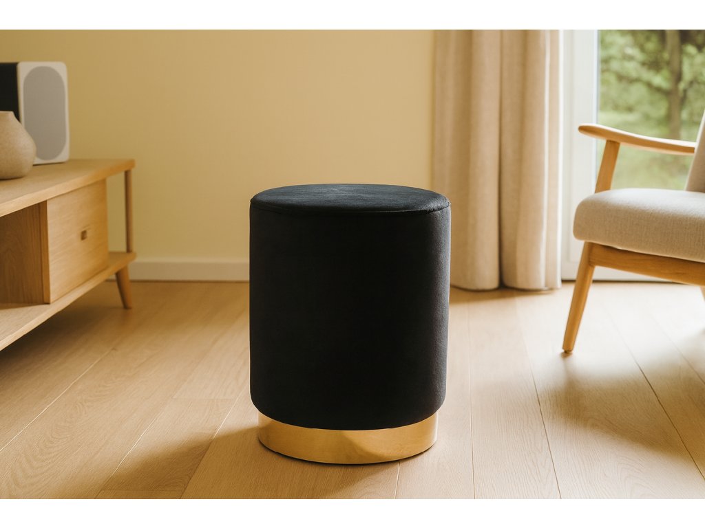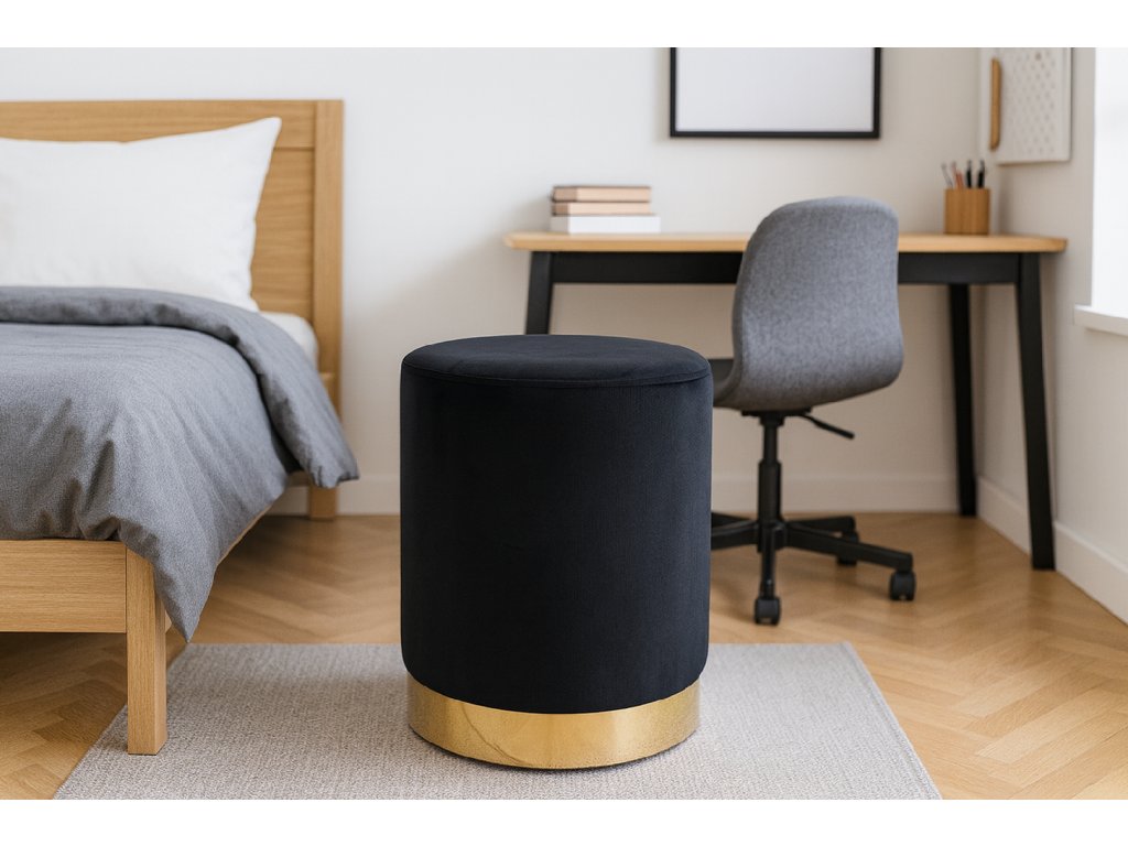 Elegantná okrúhla čierna pufa so zlatým lemom – ideálna ako sedadlo, podnožka alebo štýlová dekorácia. Kompaktný rozmer 28x42 cm, odolnosť do 80 kg. Nadčasový dizajn do každého interiéru.