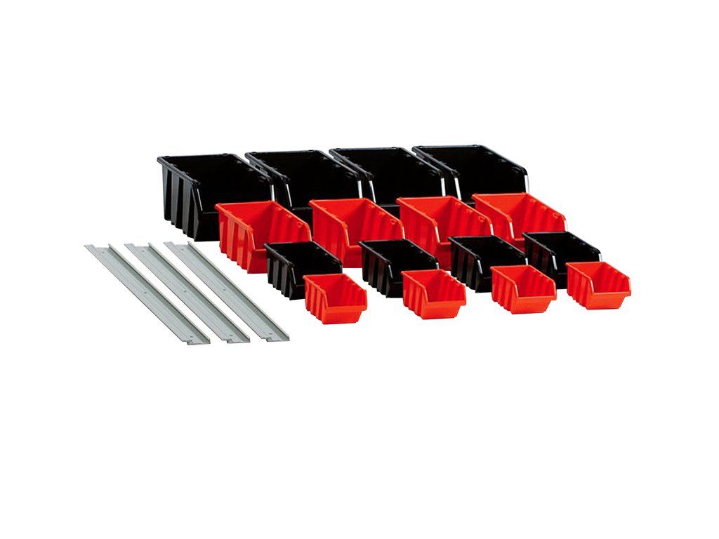 Priložené montážne lišty umožňujú rýchle a prehľadné upevnenie boxov na stenu. Takto máte uložený materiál stále po ruke, lepšie využijete priestor a pracovná plocha zostane voľná. Riešenie je vhodné aj tam, kde je potrebné často siahať po drobných súčiastkach.