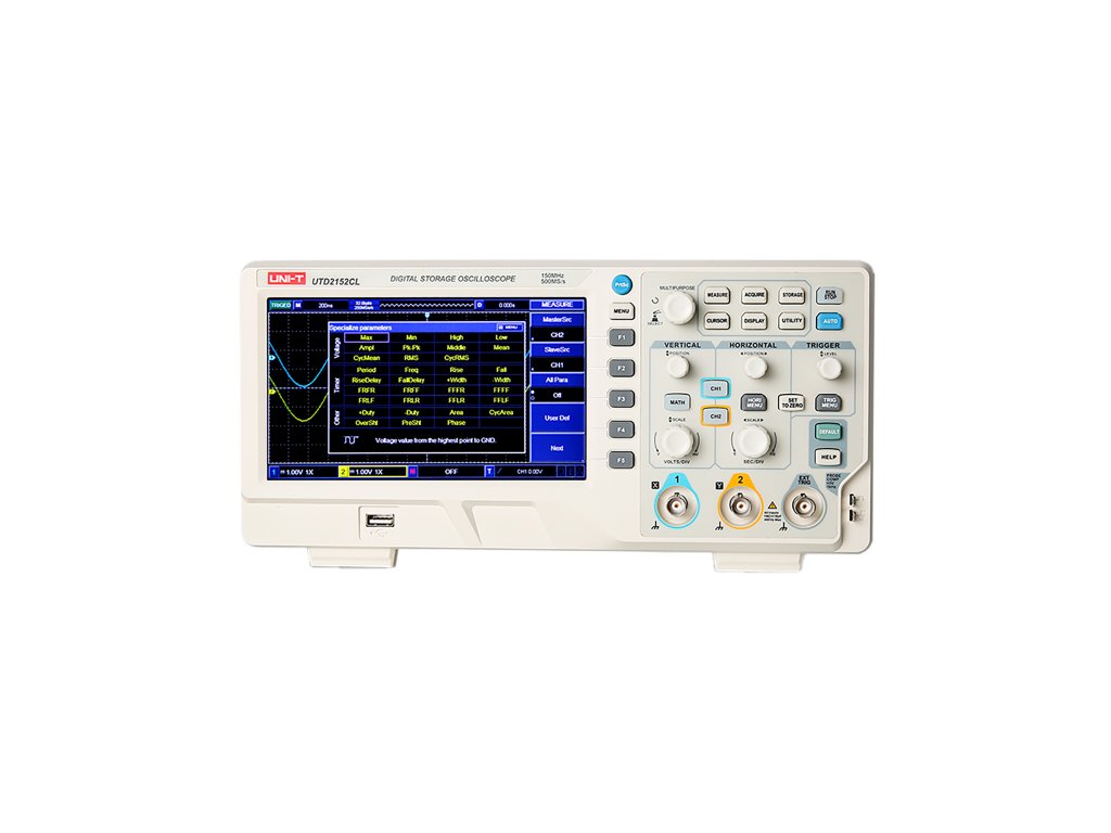 Osciloskop UTD21525CL je dvojkanálové zariadenie navrhnuté pre široké spektrum aplikácií. S jeho šírkou pásma 150 MHz je ideálny pre mnoho základných a stredne pokročilých meracích úloh. Niekoľko kľúčových vlastností a výhod tohto modelu zahŕňa:- 7-palcový farebný LCD displej: Tento veľký displej umožňuje užívateľom jasne vidieť a analyzovať signály. Farebný displej tiež zlepšuje čitateľnosť a umožňuje efektívnejšie rozlišovanie medzi rôznymi signálmi, najmä ak sú zobrazené súčasne.