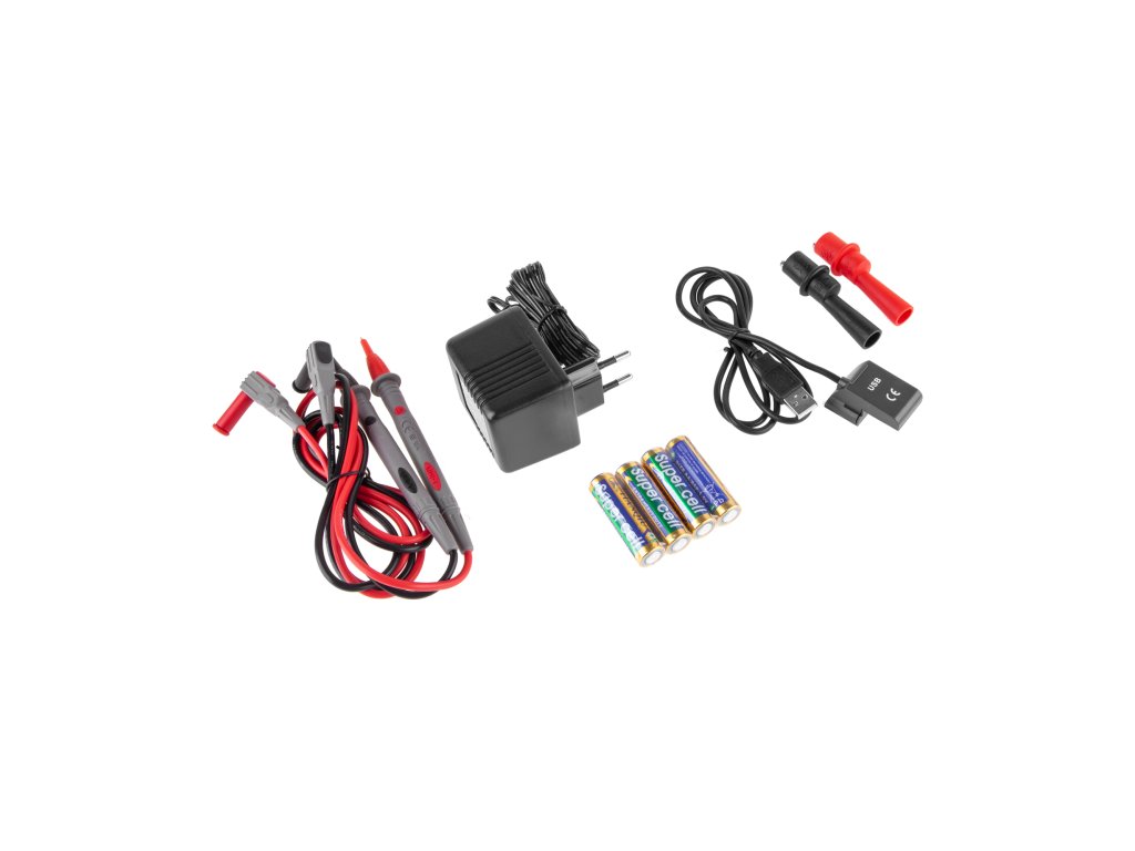 Príslušenstvo: sieťový adaptér, batérie, testovacie káble, krokosvorky, USB kábel, puzdro