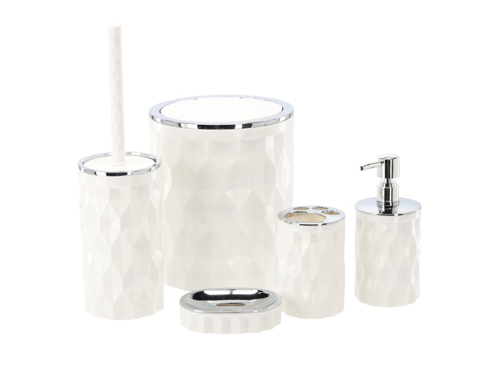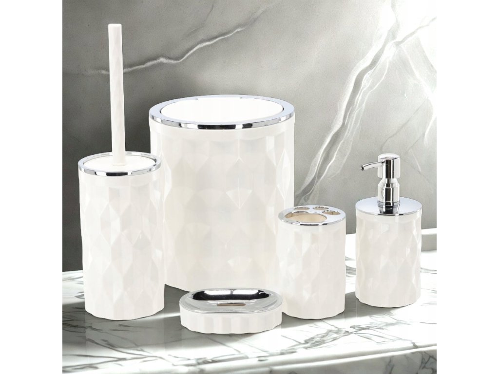 Súprava do kúpeľne 5-dielna okrúhla v bielej farbe, vyrobená z plastu.Súprava obsahuje: