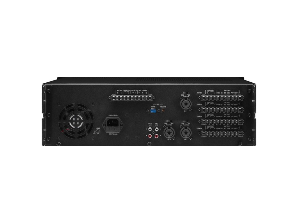 | Konektory | 3 x Combo 6.3mm/XLR (mic/line), 2 x RCA L/R (line), 1 x RJ45 (mikr. push-to-talk), 4 x skrutkové terminály (reproduktory), 1 x 6.3mm (monitor), 4 x RJ45 (alarmové hlásenia), 4 x skrutkové terminály (predzosilňovač) |