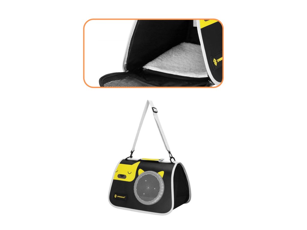 - Horná časť je mierne vystužená a spája sa s bočnými stenami a dnom pomocou jedného obojsmerného zipsu. Na prednej strane má ozdobnú potlač a prišité logo Springos.