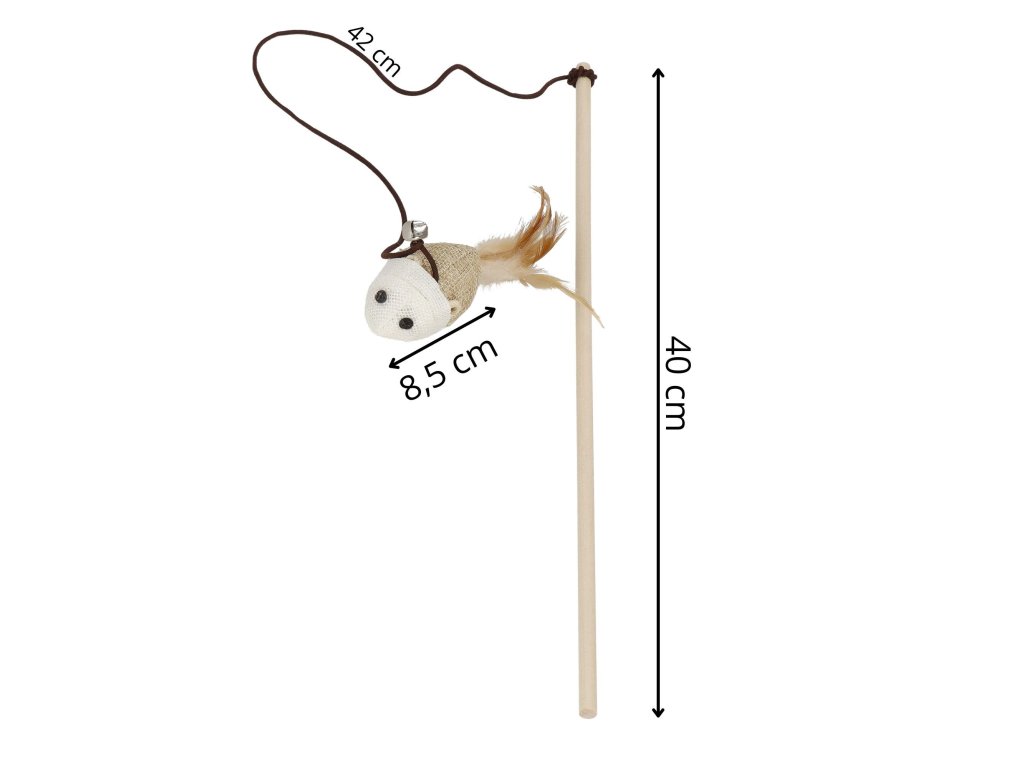- Dĺžka paličky: 40 cm Dĺžka šnúrky: cca 42 cm (bez natiahnutia) Rozmery myšky: dĺžka 8,5 cm (+ cca 8 cm pierka); šír. x výška: 5 x 4 cm Šírka zvončeka: cca 1 cm