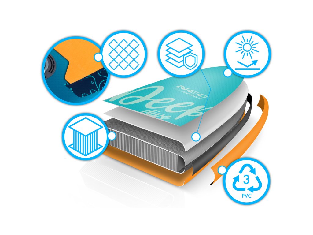 Prémiová SUP doska s trojvrstvovou PVC konštrukciou, vstavanou koľajnicou z uhlíkových vlákien a zosilnenými švami.