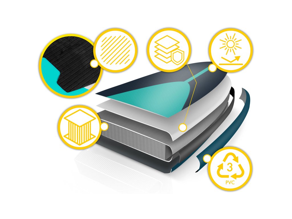 Doska SUP triedy premium s trojvrstvovou konštrukciou PVC, vstavanou uhlíkovou lištou a zosilnenými švami.