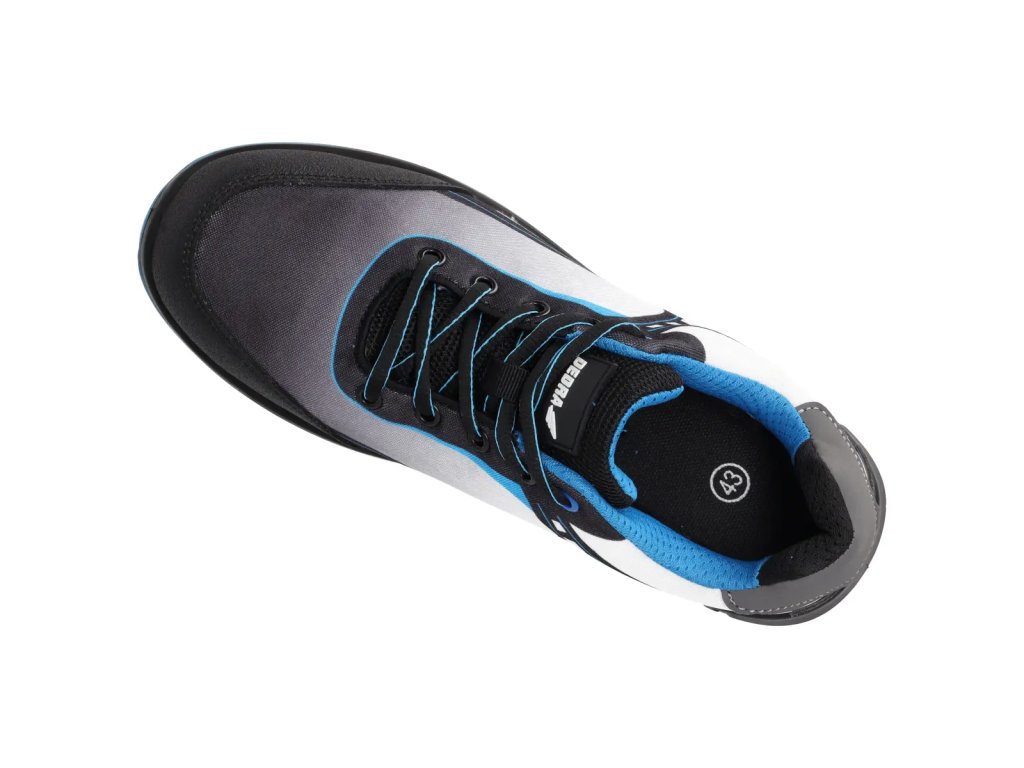 Zvršok tejto obuvi je vyrobený z priedušného a pohodlného materiálu, a vnútorná podšívka z mriežky zabezpečuje správnu cirkuláciu vzduchu v obuvi. Obuv má oceľovú špičku odolnú voči nárazom a mechanickému poškodeniu.