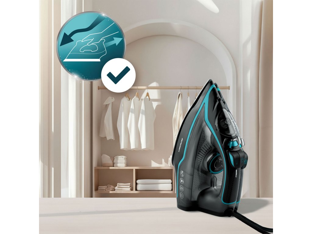 Keramická plocha s mikročanelikmi – dokonale rozvádza paru, vďaka čomu je žehlenie rýchlejšie a efektívnejšie.
