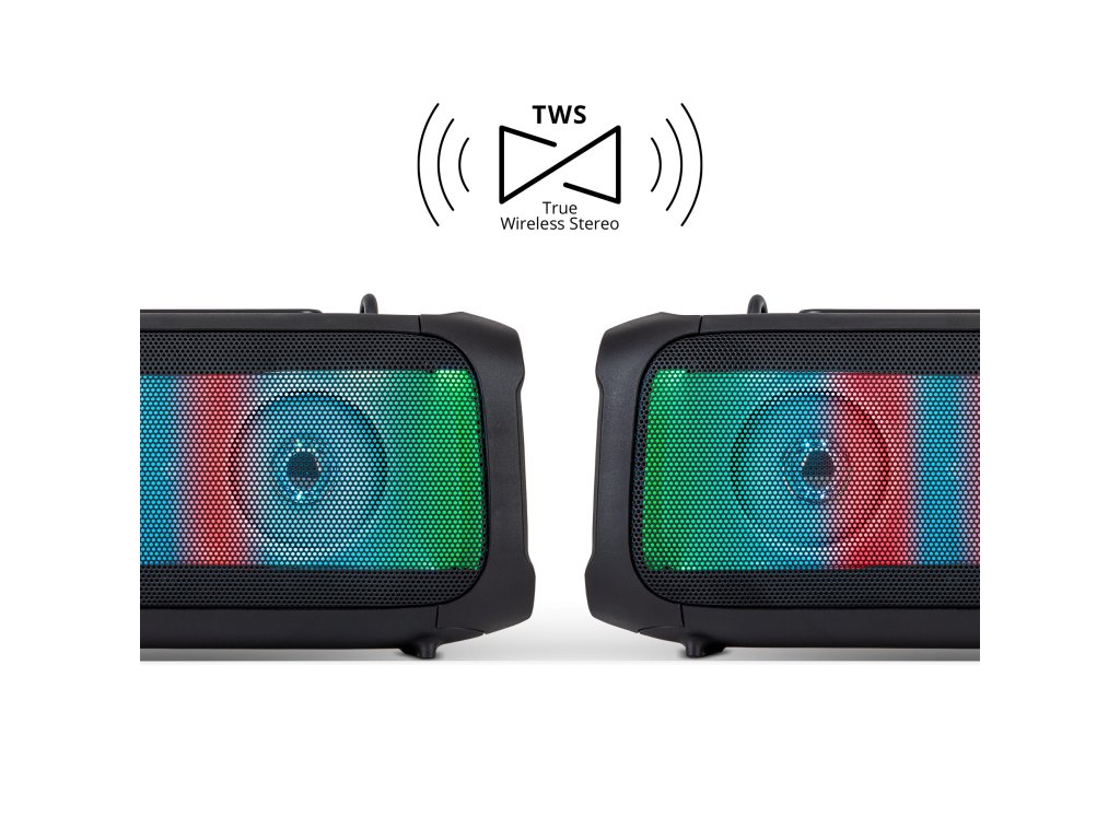 Za zmienku stojí aj množstvo médií, pomocou ktorých môžete prehrávať hudbu na reproduktore Music Box Go! Okrem bezdrôtového prenosu cez Bluetooth 5.0 máte k dispozícii aj USB 2.0, AUX a čítačku kariet micro SD. Navyše funkcia True Wireless Stereo umožňuje bezdrôtovo spárovať dva reproduktory Kruger&Matz, čím dodáte svojej párty viac hudobnej sily.