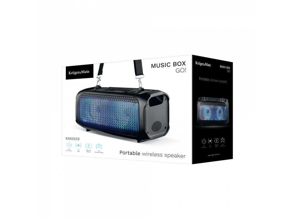 Vyberte si ten správny reproduktor, ktorý nielenže rozprúdi hudobnú atmosféru počas stretnutí s priateľmi, ale môže takéto stretnutie premeniť na skutočnú párty. Reproduktor s led diódami Kruger&Matz Music Box Go! je ľahké a kompaktné zariadenie, ktoré si môžete ľahko vziať so sebou k táboráku alebo k priateľom. To všetko vďaka pohodlnému remienku, ktorý je k zariadeniu pripojený.