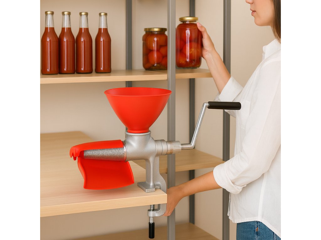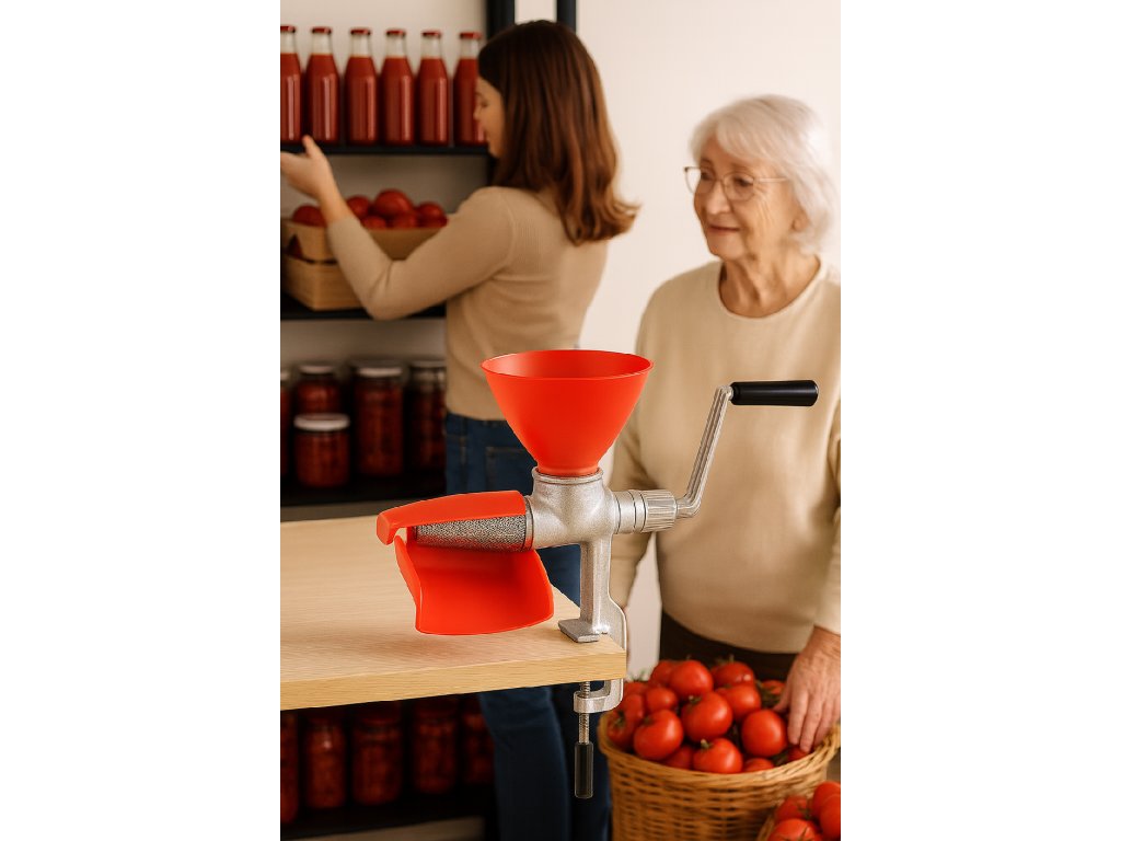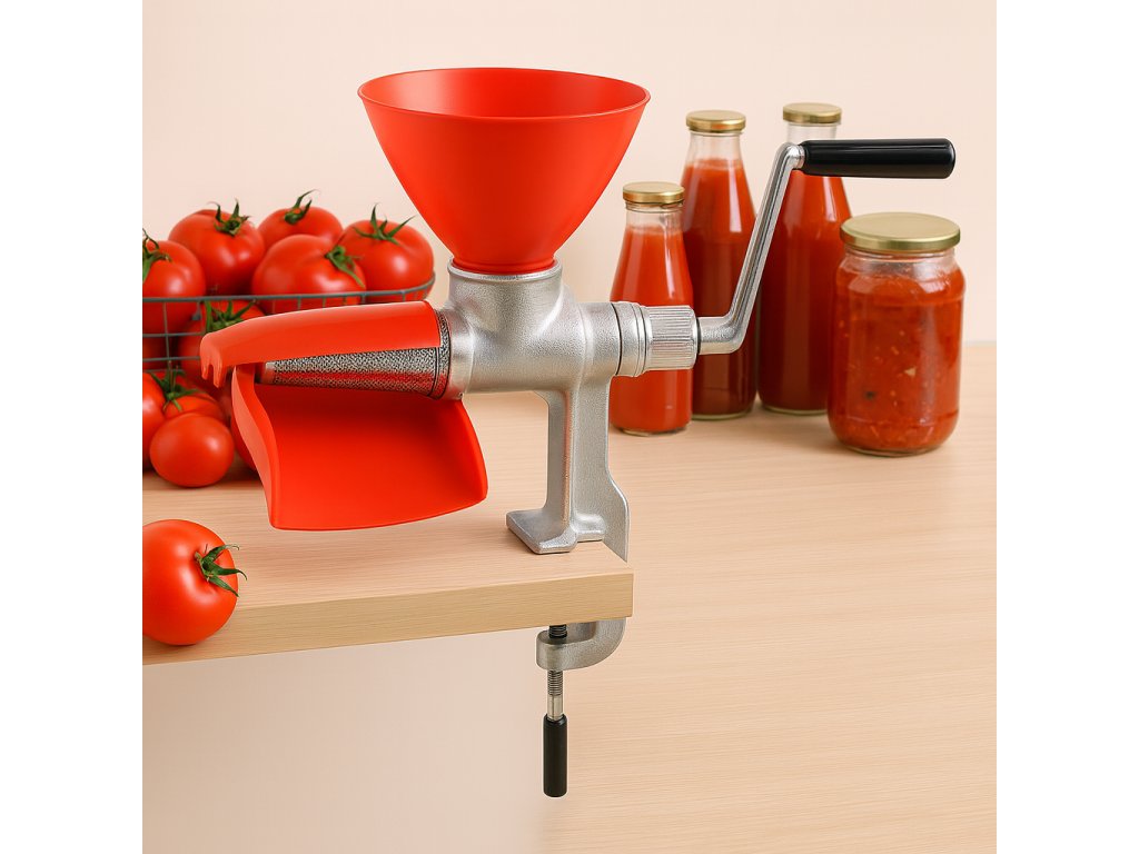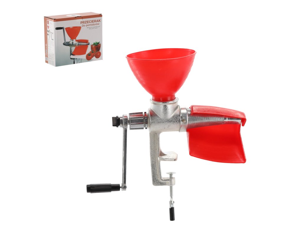 Tradičný pasírovač na paradajky z liatiny a plastu, zaisťujúci stabilitu a pohodlie pri používaní. Možnosť pripevnenia k doske pre väčšiu stabilitu.