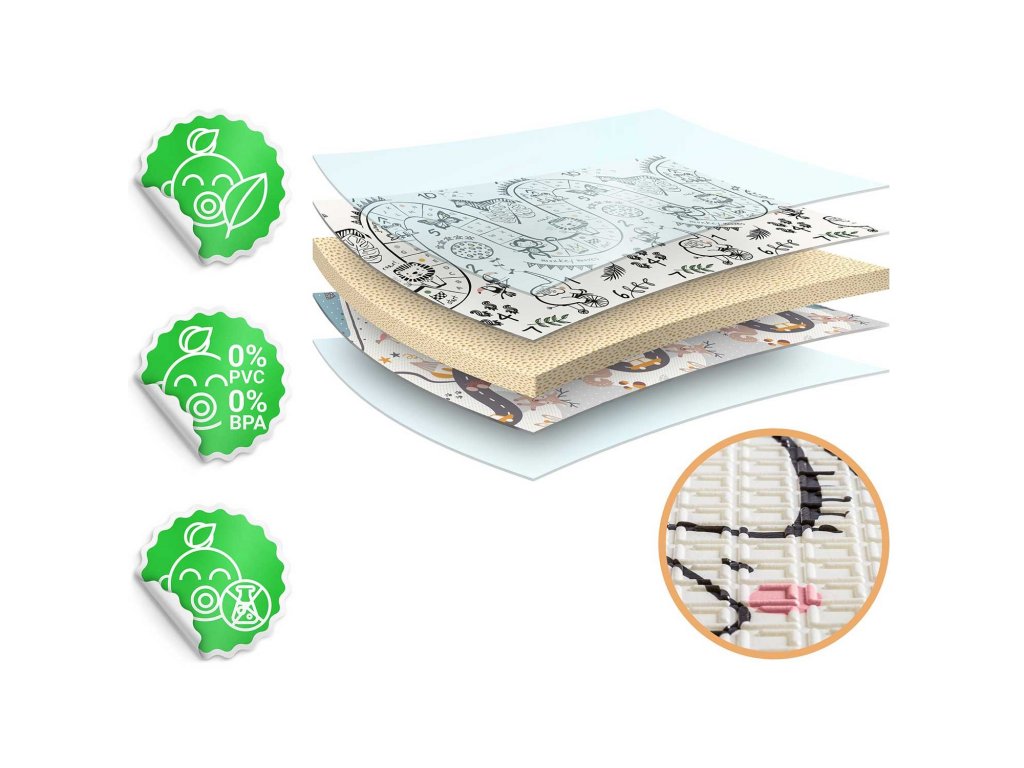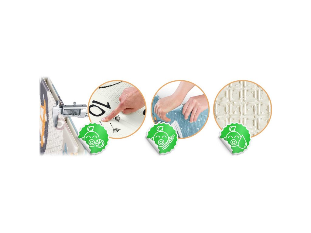 Vyrobené z vysoko kvalitnej peny XPE bez zápachu, bezpečnej pre vaše dieťatko. Mimoriadne hrubá pena (1 cm! ) tlmí pády na tvrdých podlahách.