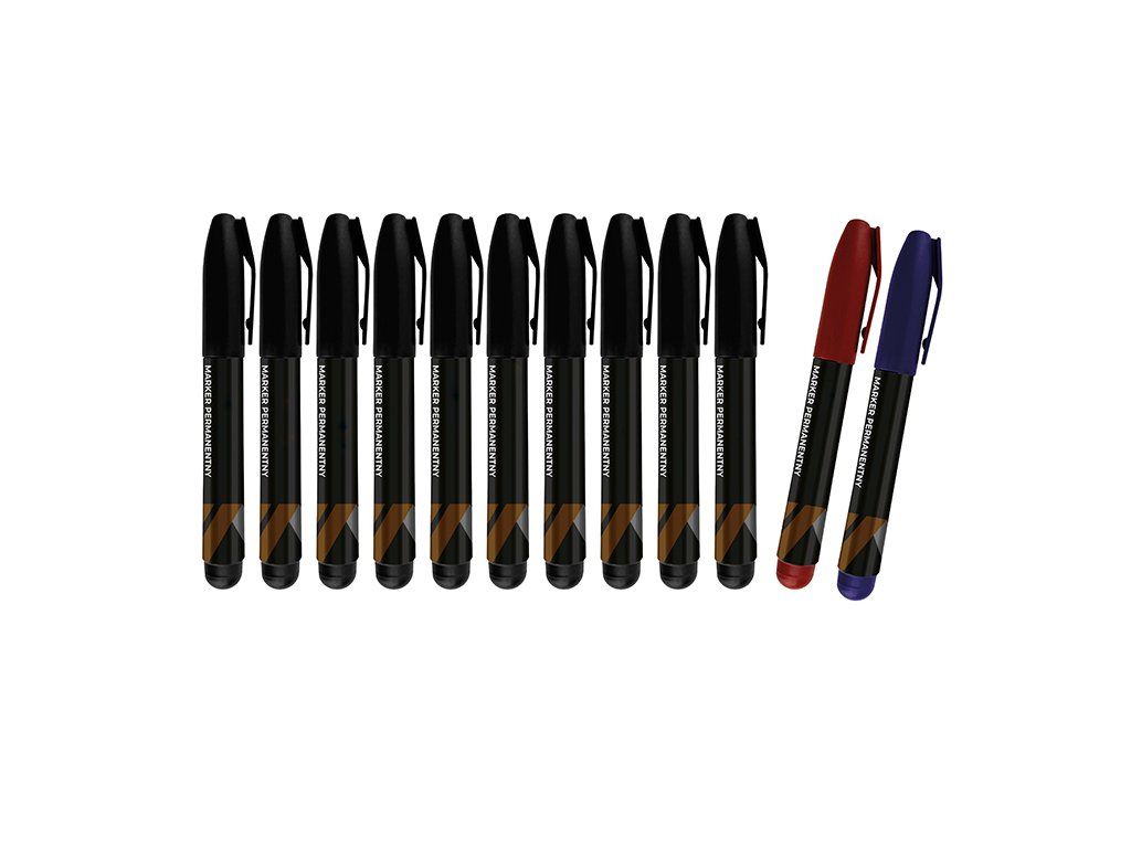 V balení sa nachádza 12 permanentných markerov v praktickom farebnom mixe. Prevažuje čierna farba, ktorú dopĺňa modrá a červená fixka. Toto zloženie je vhodné najmä na bežné značenie, triedenie a jednoduché odlíšenie poznámok či označení.