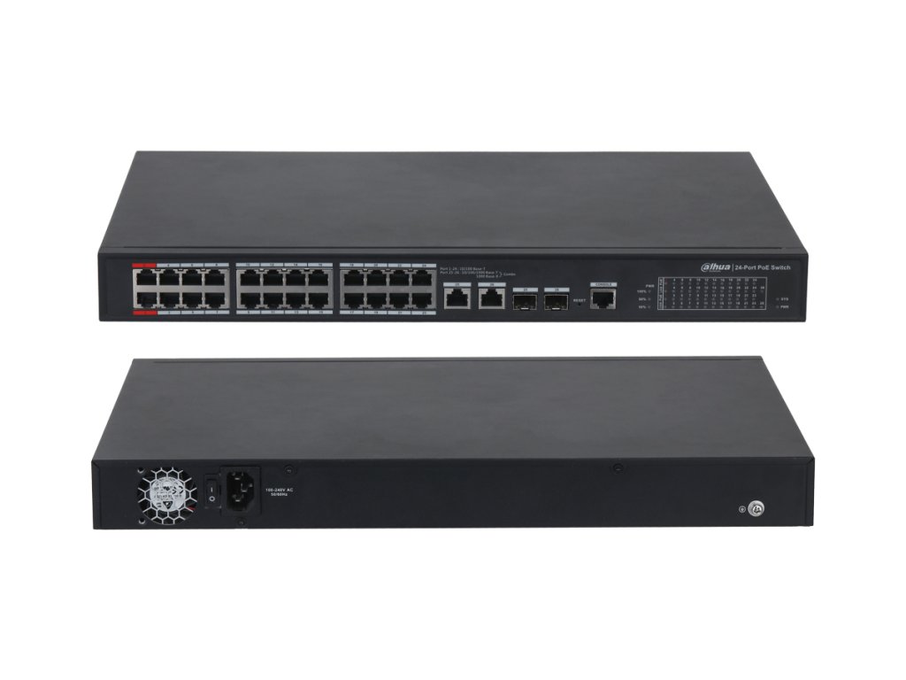 irmy DAHUA určený na prácu s veľkými video prúdmi v systémoch sledovania CCTV IP. Umožňuje bezproblémovú nepretržitú prácu 24h sedem dní v týždni. Zariadenie má 24 portov RJ45 10/100Mbps s podporou technológie PoE 802.3af/at (power over ethernet) a 2 porty RJ45 Uplink 1 Gbps zdieľané (Combo) s 2 portami na vložky SFP, ako aj ochranu proti vybitím blesku a rozdielom potenciálov medzi zariadeniami. Technické parametre: