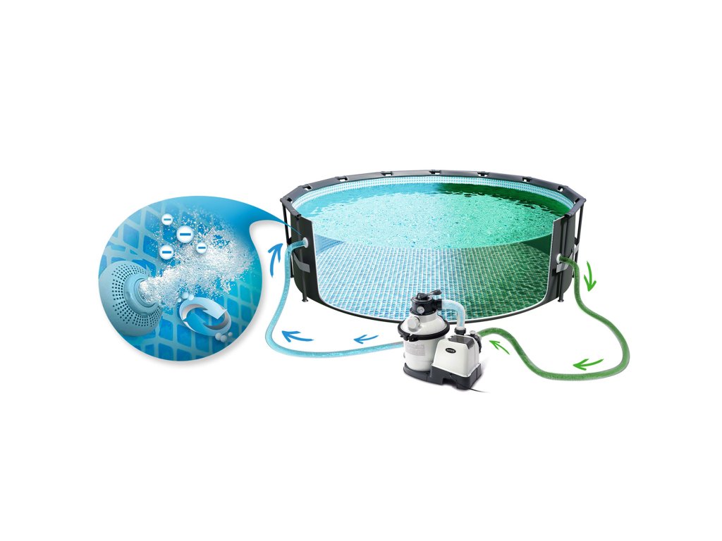 Intex prináša revolúciu v záhradných bazénoch - prevzdušňovanie vody počas jej filtrácie, dostupné vo všetkých čerpadlách tohto výrobcu.