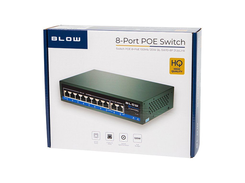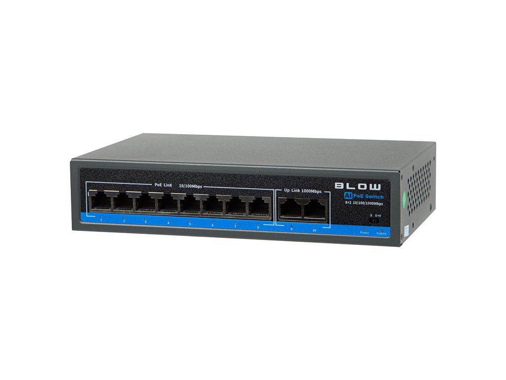 Poe switch 100w 77-936- značky BLOW je praktické sieťové riešenie pre malé aj stredne náročné inštalácie, kde je potrebné napájať zariadenia priamo cez sieťový kábel. Model BL-SW10-8P ponúka 8 PoE portov, 2 UpLink porty a celkový výkon 100 W, vďaka čomu je vhodný najmä pre IP kamery, VoIP telefóny, prístupové body a ďalšie PoE zariadenia.