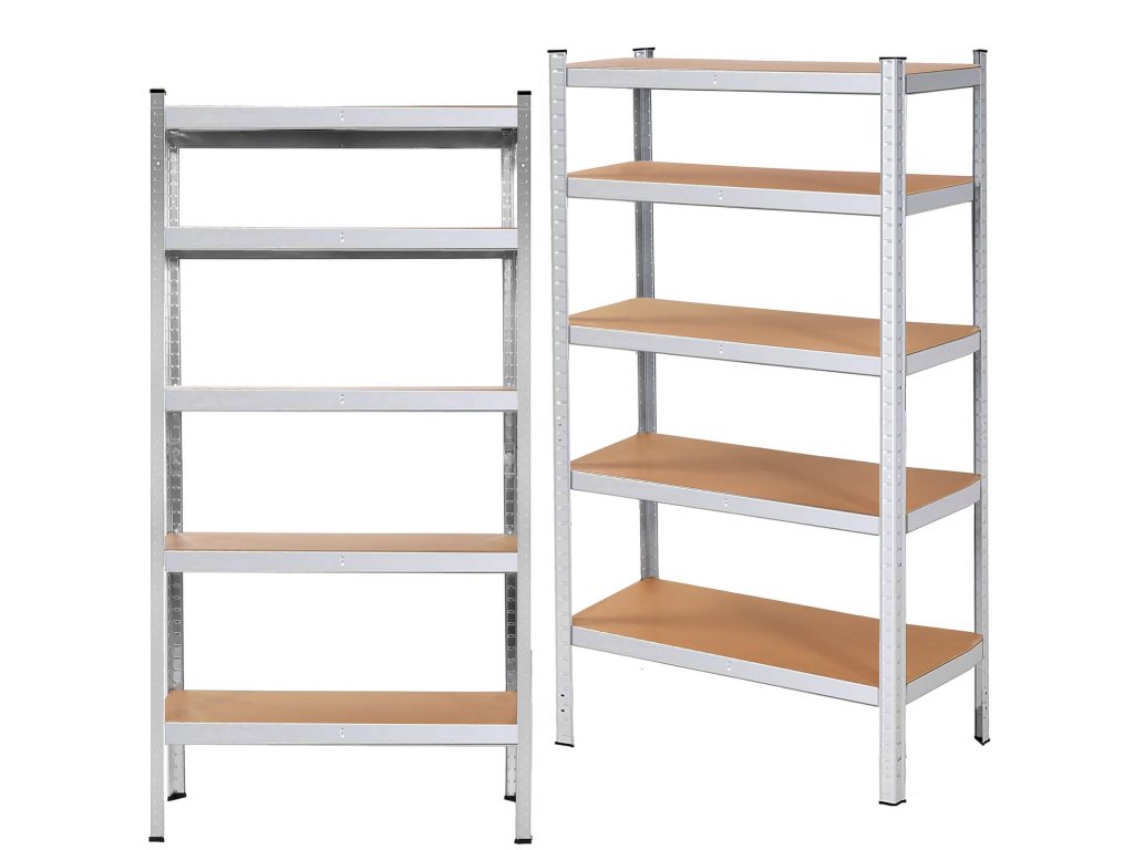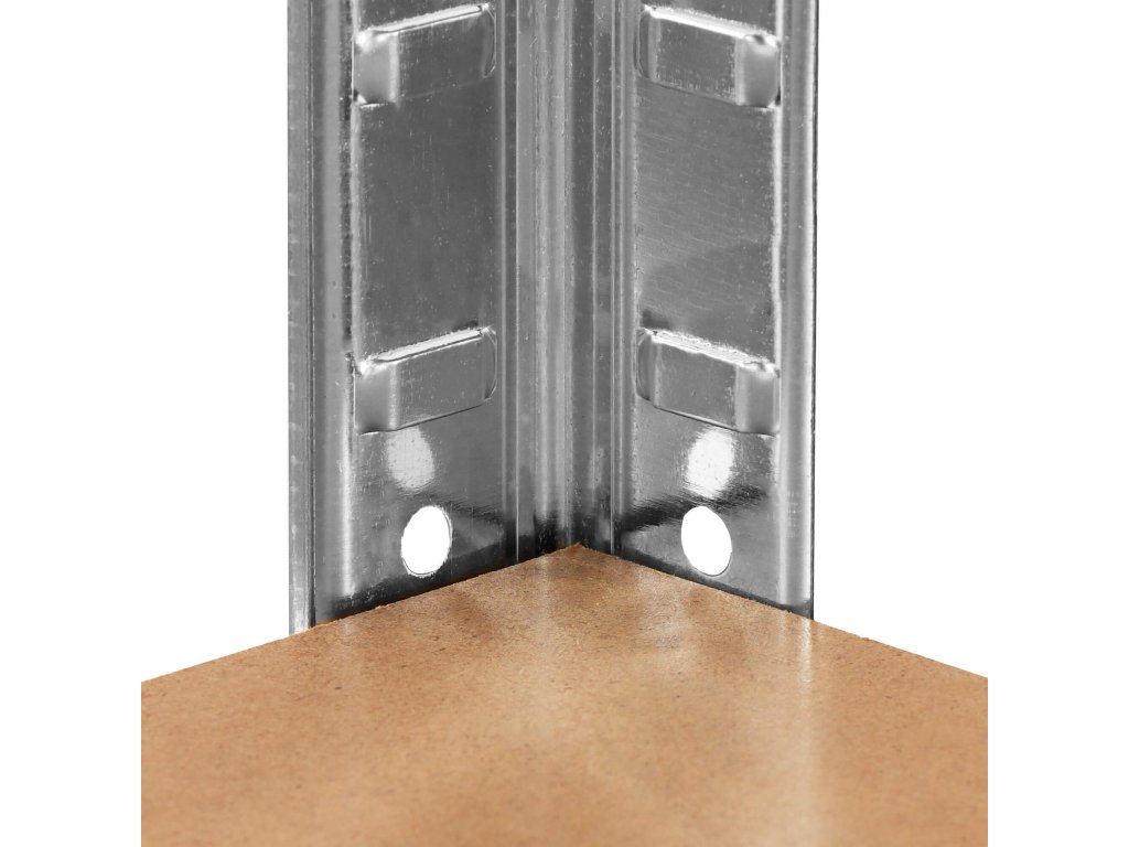 - Každá polica je podopretá horizontálnymi prvkami konštrukcie, s jednou krížovou vzperou uprostred pod každou policou