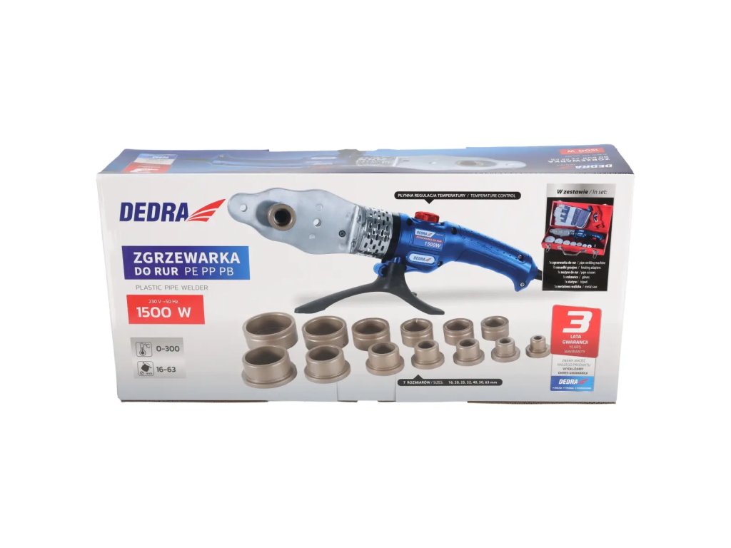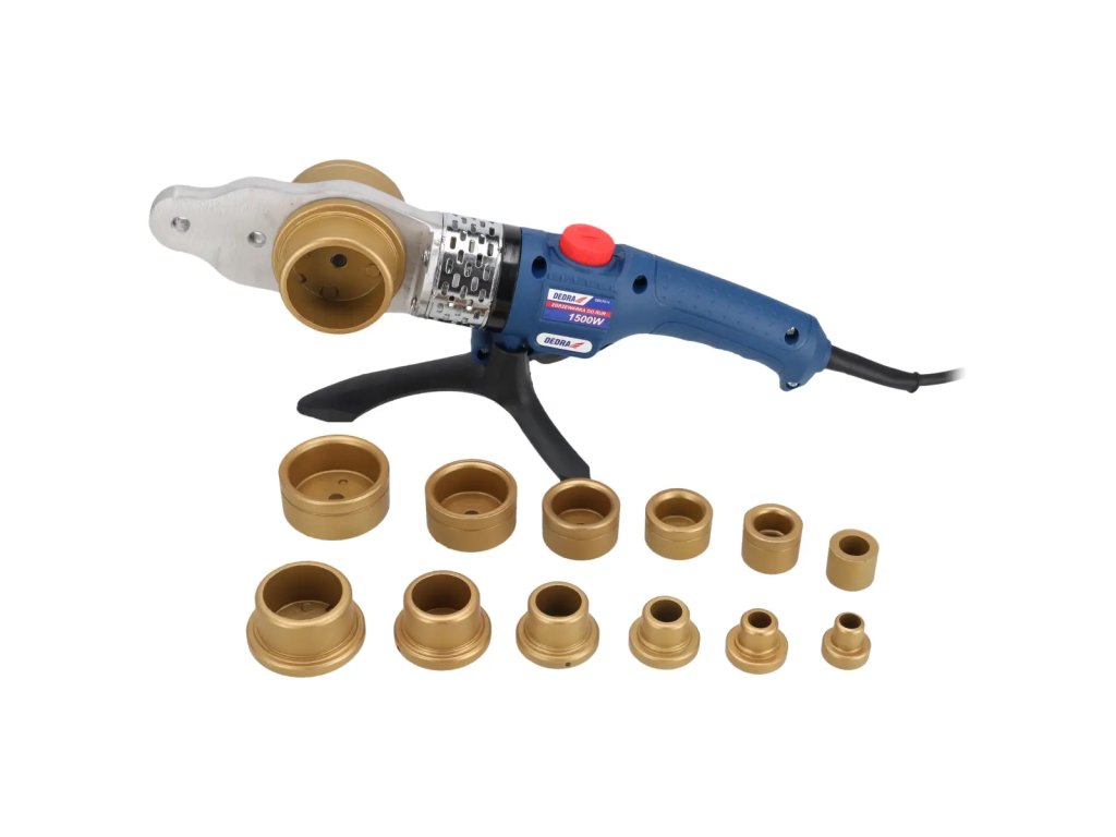 Prístroj DED7514 s výkonom 1500 W sa používa na zváranie polymérových rúr a tvaroviek (PE-polyetylén, PP-polypropylén, PB-polybutén) používaných na inštalácie vody alebo ústrednéhok ú r e n i a . Stroj je vybavený vymeniteľnými vyhrievacími podložkami,k t o r é umožňujú súčasné vyhrievanie vnútorného a vonkajšieho povrchu spájaných dielov. DED7514 je vybavený plynulou reguláciou teploty až do maximálnejteploty300°C.Vlastnosti rúrového horáka DEDRA DED7514: