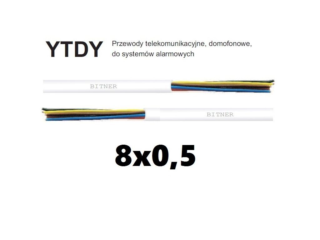 Kábel YTDY 8x0,5mm od firmy Bitner je telekomunikačný kábel (T), jednolinková žila s priemerom 0,5mm (D), polyvinylovou izoláciou (Y) a polyvinylovým plášťom (Y).
