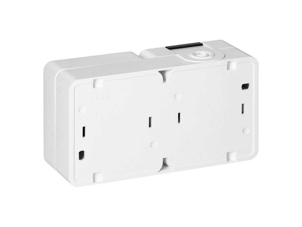 Povrchová jednoduchá zásuvka 2P+E s dymovým krytom + jednopólový vypínač, IP44, SMART, biela