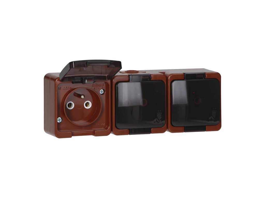 Trojnásobná povrchová zásuvka 3x2P+E, odolná voči striekajúcej vode s dymovým krytom, IP44, SMART, hnedáDodatočné parametre