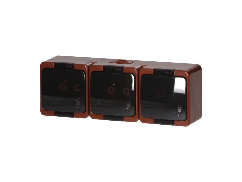 Povrchová trojitá zásuvka 3x2P+E, vodeodolná s dymovým krytom, IP44, SMART, hnedá