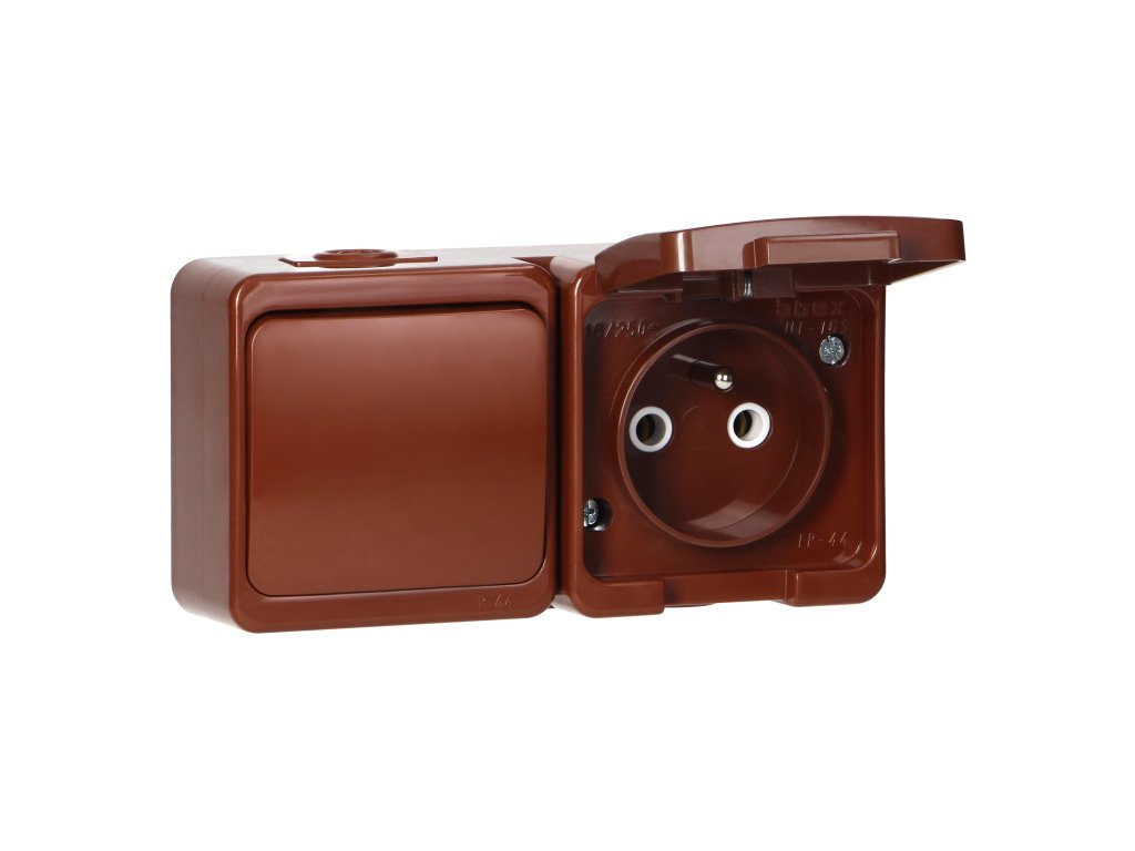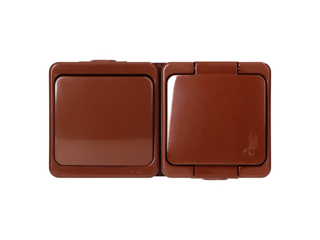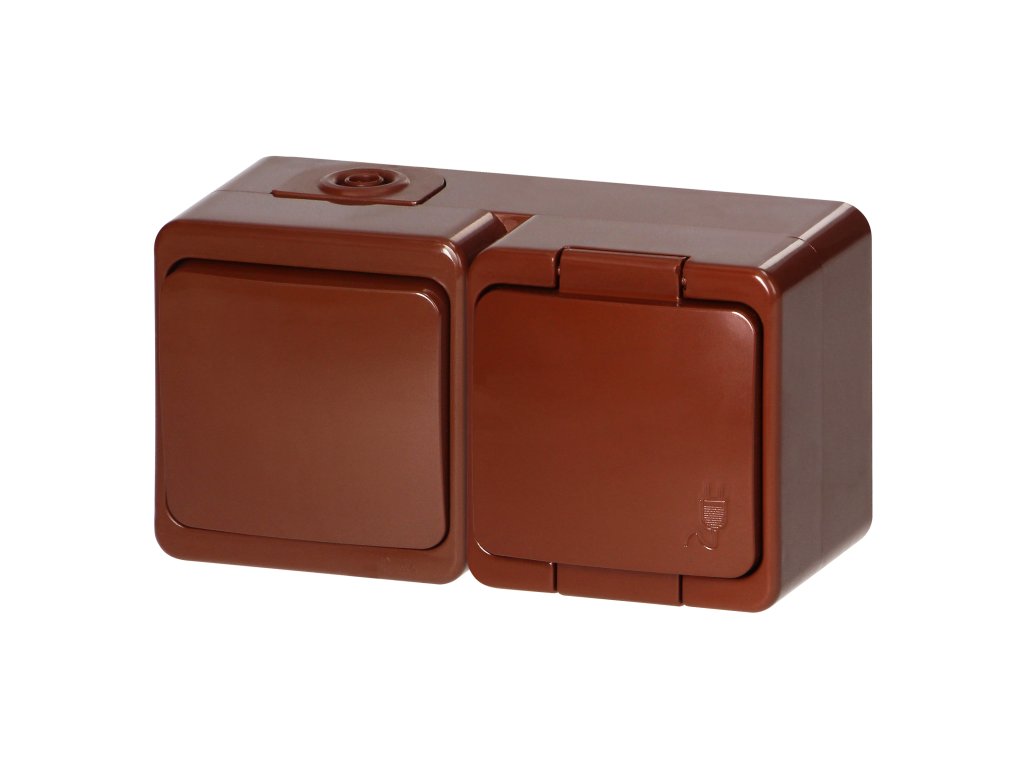 Povrchová zásuvka 2P+E s krytom + jednopólový vypínač, IP44, SMART, hnedá