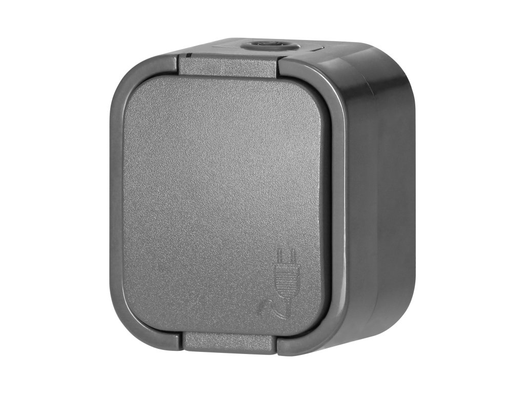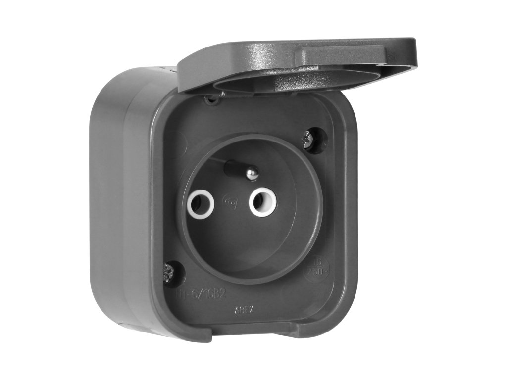 Povrchovo montovaná jednoduchá zásuvka 2P+E, striekajúca s krytom B2, IP54, NT-16B2, sivá
