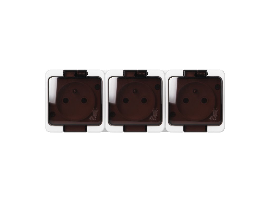 Trojitá nástenná zásuvka 3x2P+E, odolná proti striekajúcej vode s dymovým krytom, IP44, SMART, biela.Dodatočné parametre