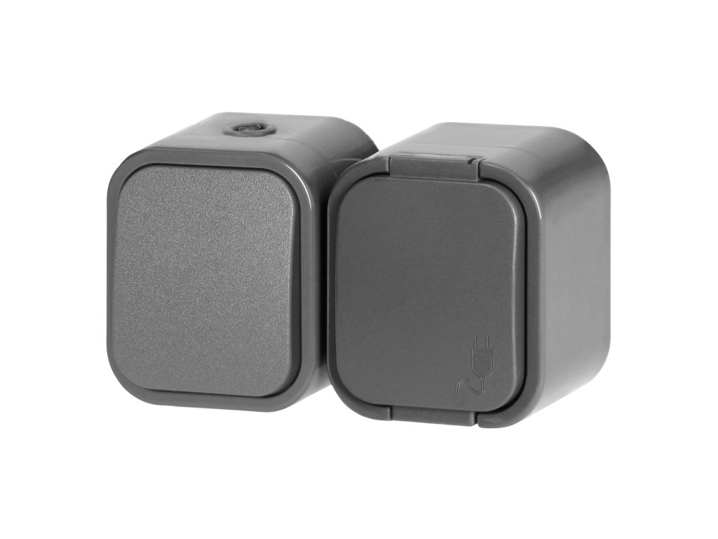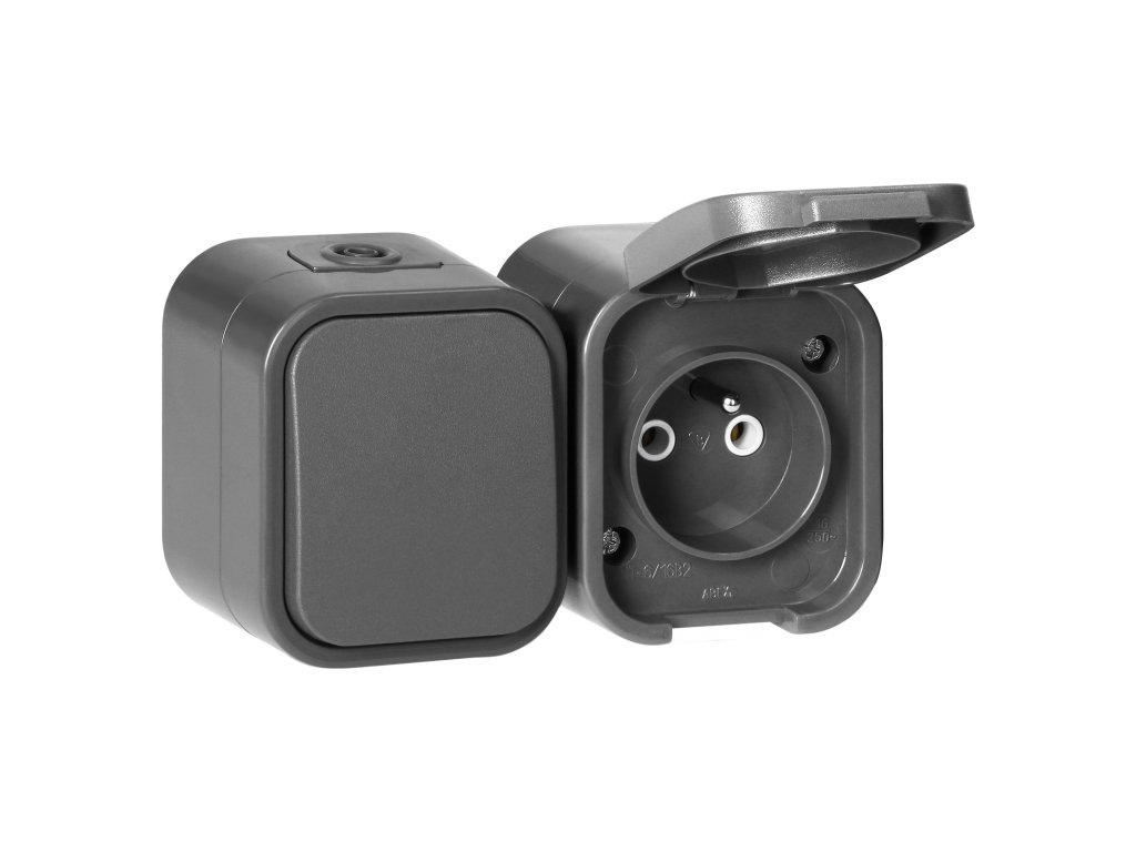 Povrchový jednopólový spínač + Jednoduchá zásuvka 2P+E B2, IP54, GWN-B2, šedá