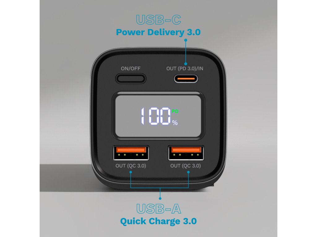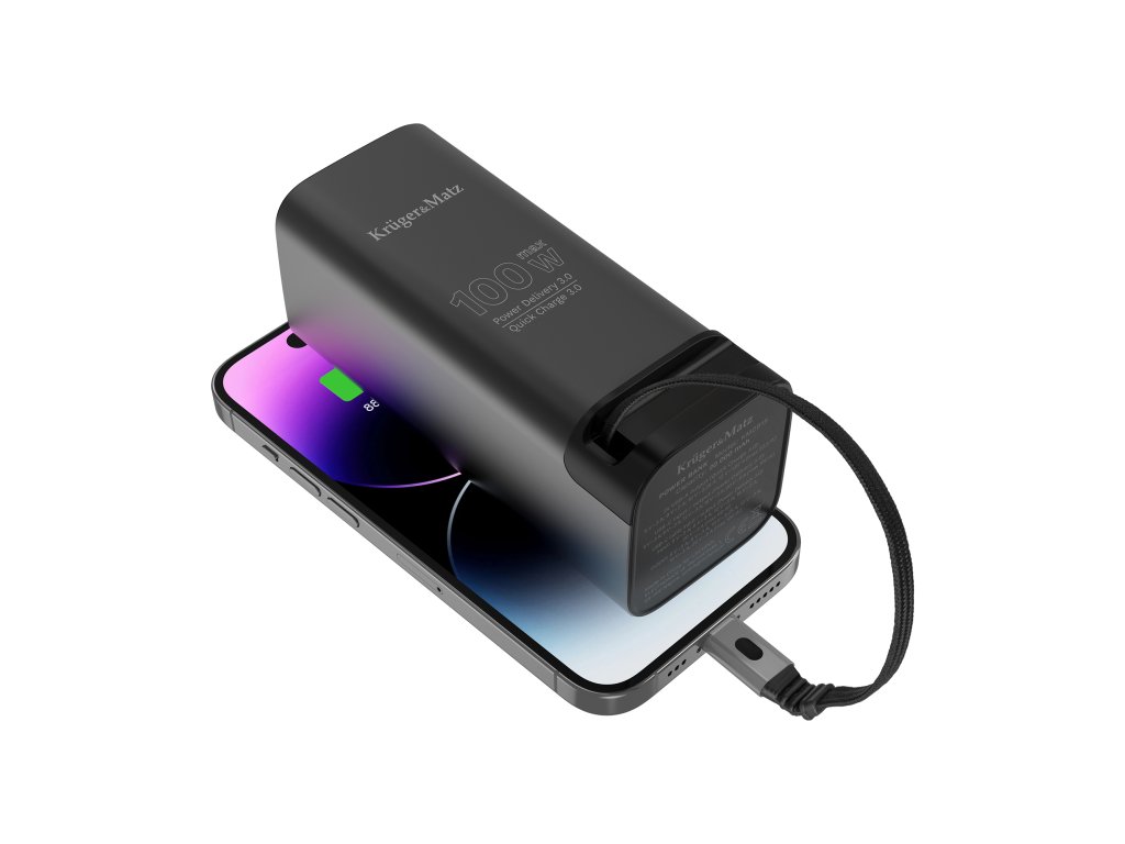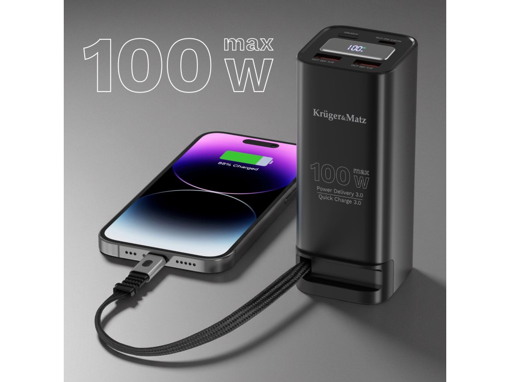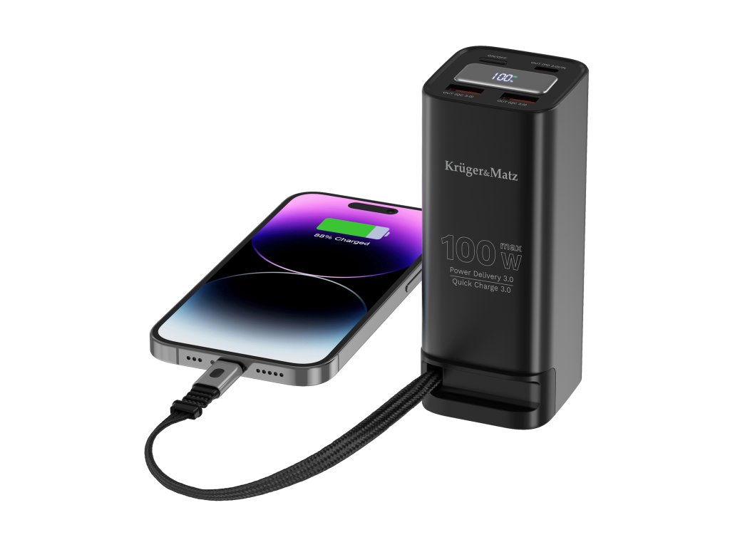 To, čo púta pozornosť na power banku Kruger&Matz, je súbor portov, ktoré zaručujú maximálnu všestrannosť. K dispozícii máte USB-C s podporou Power Delivery 3.0 a dva porty USB-A podporujúce Quick Charge 3.0, ako aj integrovaný USB-C kábel s dĺžkou 60 cm. Vďaka tomu môžete naraz nabíjať viacero zariadení – smartfón, tablet, konzolu či slúchadlá – bez nosenia ďalších káblov. Je to pohodlie, ktoré rýchlo nevymeníte za nič iné.