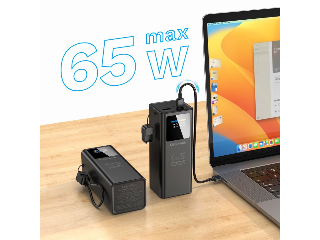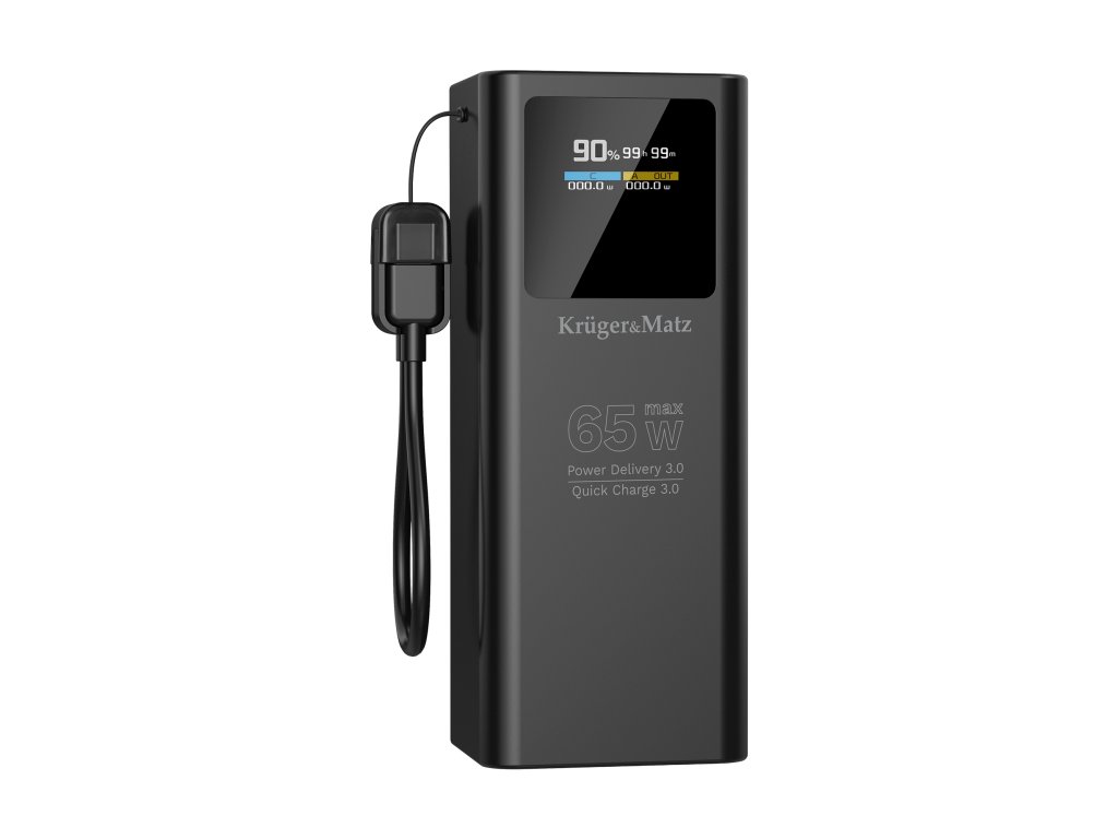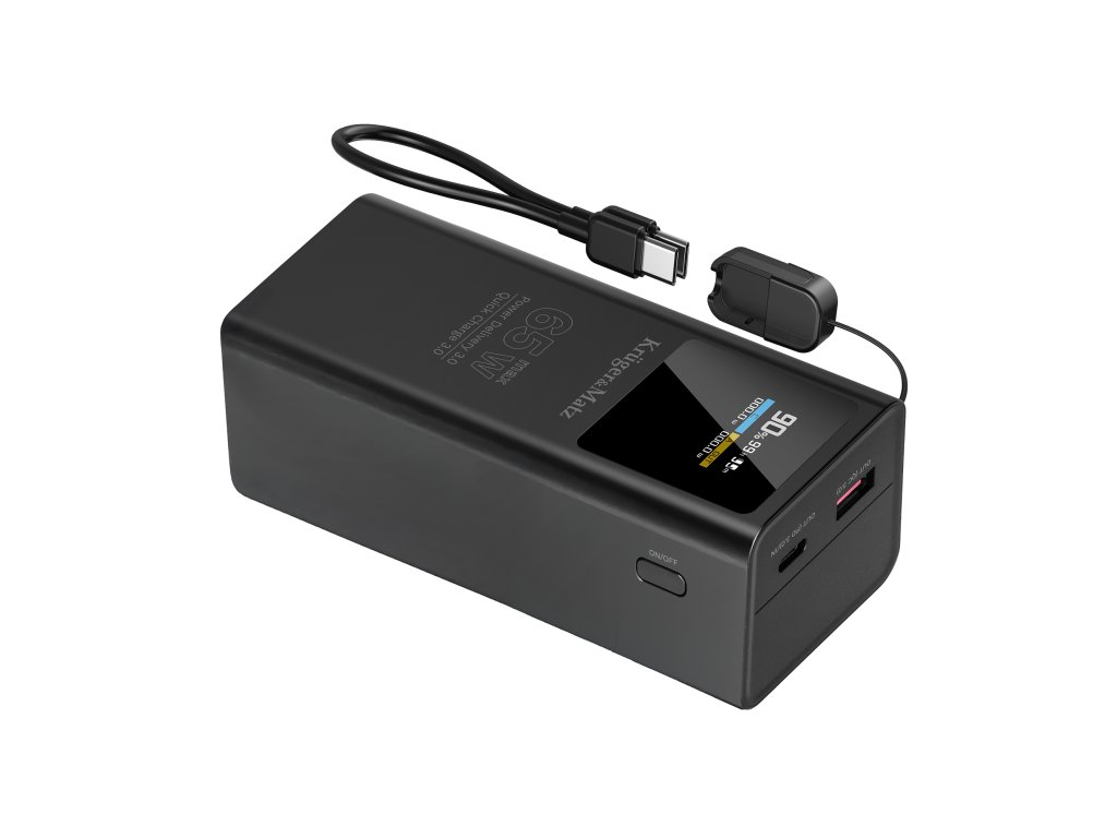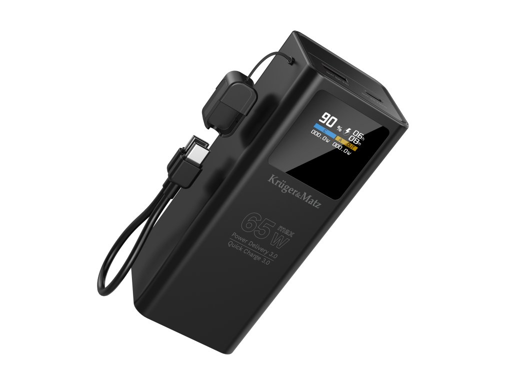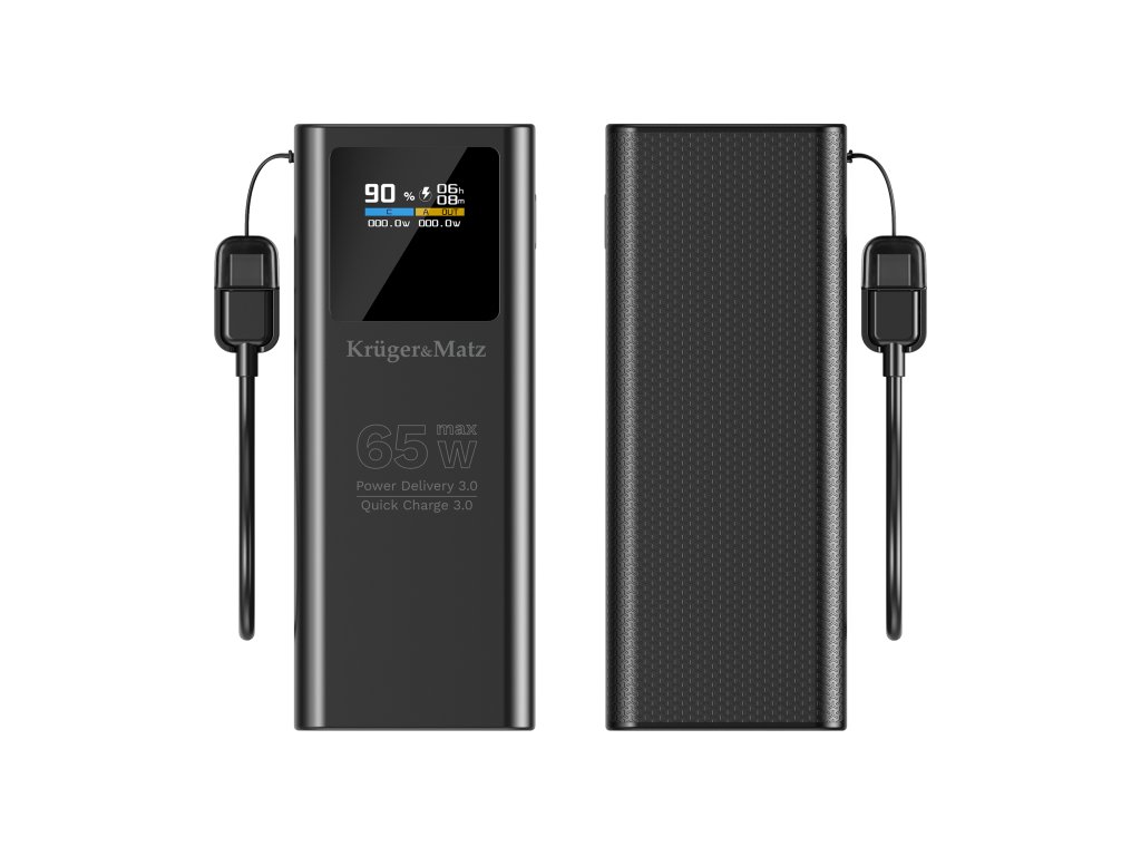 Power bank Kruger&Matz podporuje technológiu Power Delivery 3.0 do 65 W, vďaka čomu bez problémov nabije nielen telefón, ale aj ultrabook či konzolu. Quick Charge 3.0 zabezpečuje expresné doplnenie energie v kompatibilných smartfónoch. Tento kompaktný zdroj napájania zaručuje, že aj náročné zariadenia budú vždy pripravené na prácu, keď ich budete potrebovať.