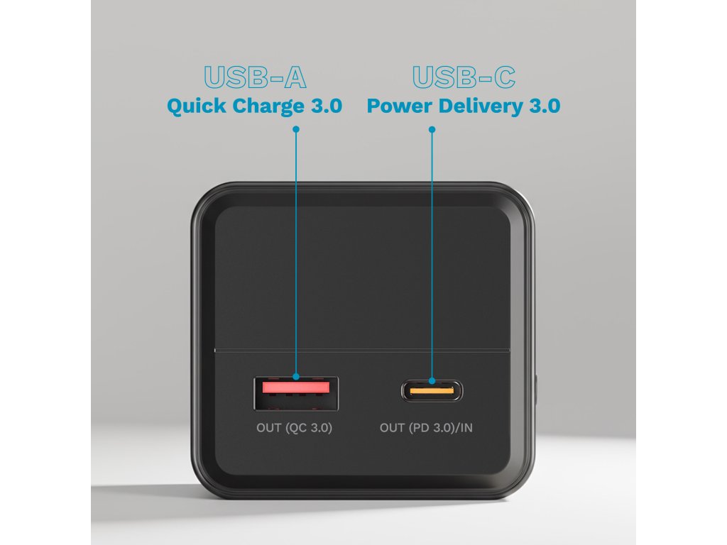 Zariadenie je vybavené dvomi konektormi: USB-C s Power Delivery 3.0 a USB-A s Quick Charge 3.0. Vďaka tomu power bank umožňuje rýchle a pohodlné nabíjanie prakticky každého zariadenia – od smartfónov a slúchadiel, cez tablety, až po notebooky. Čo viac, oba porty môžete používať súčasne, aby ste napájali dve zariadenia naraz, bez nutnosti nosiť ďalšie nabíjačky.