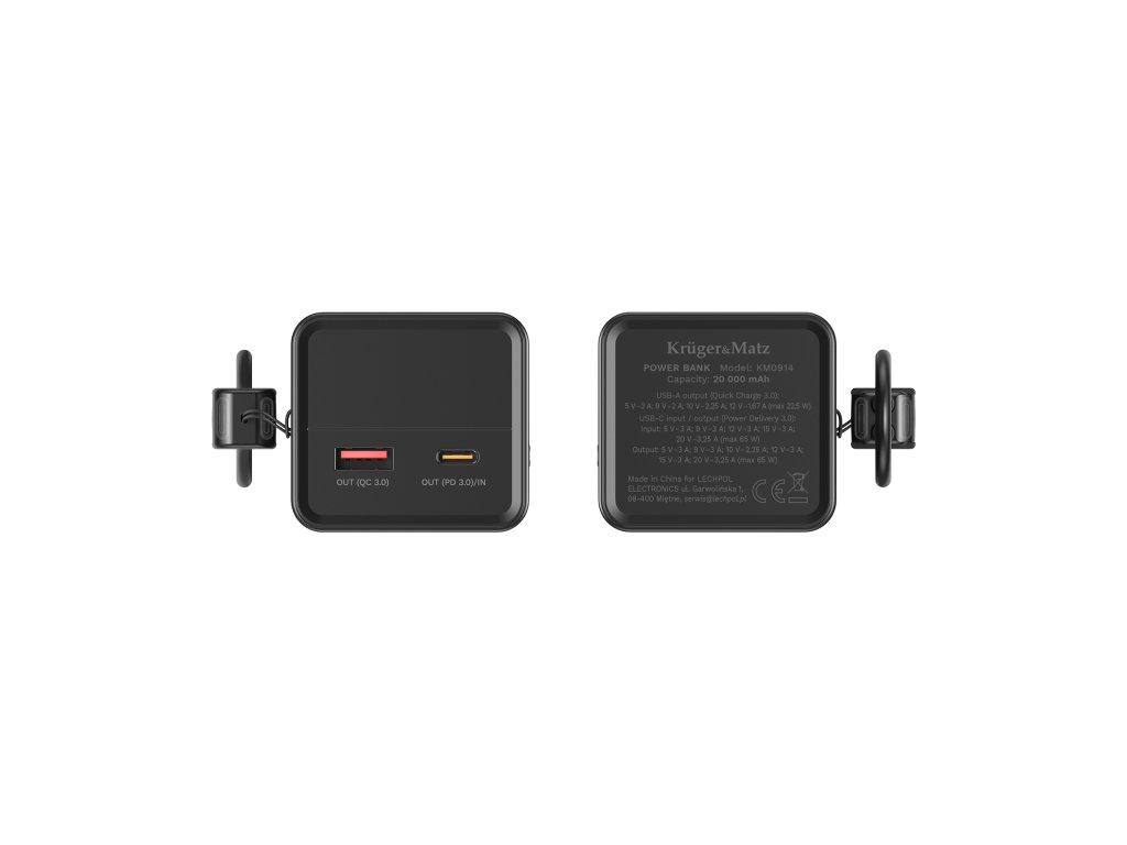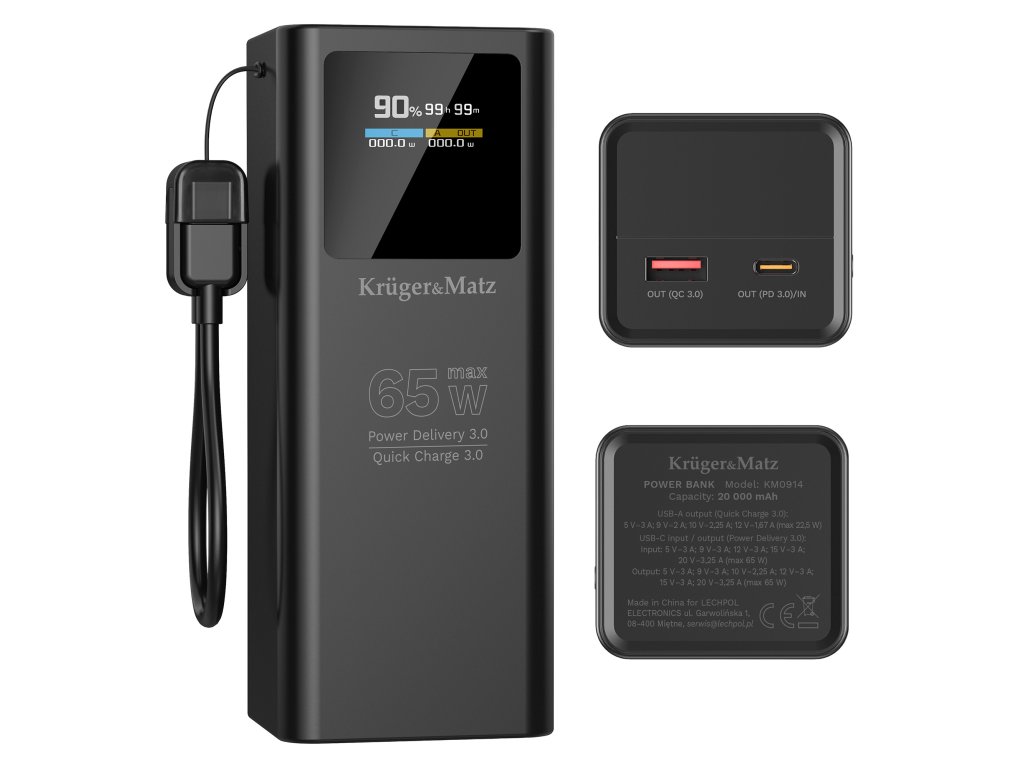 Power bank Kruger&Matz KM0915 s kapacitou 20 000 mAh je zárukou, že vám energia nebude chýbať na cestách, v práci či na škole. S ľahkosťou ním niekoľkokrát nabijete smartfón, doplníte batériu v tablete a dokonca i v notebooku. Vstavaný LCD displej informuje o úrovni energie, napätí a čase nabíjania, vďaka čomu vždy viete, koľko energie máte k dispozícii.