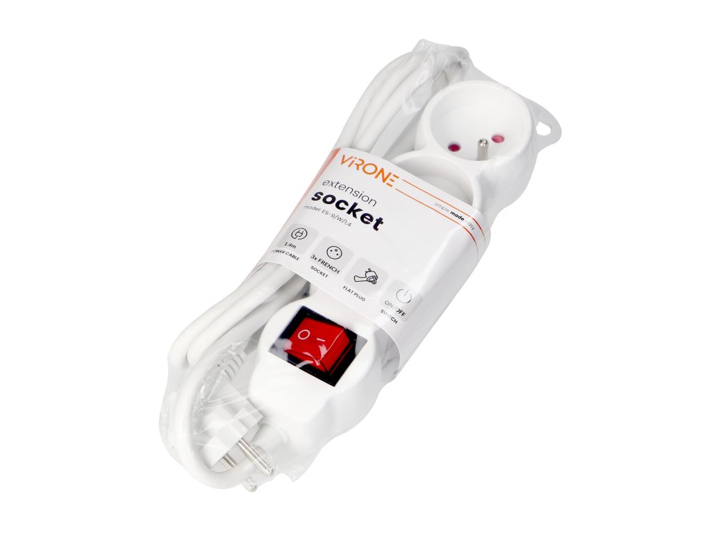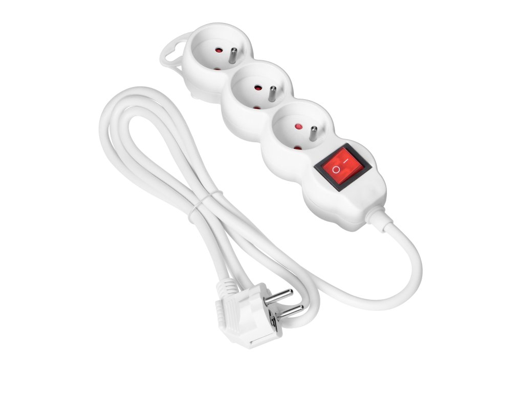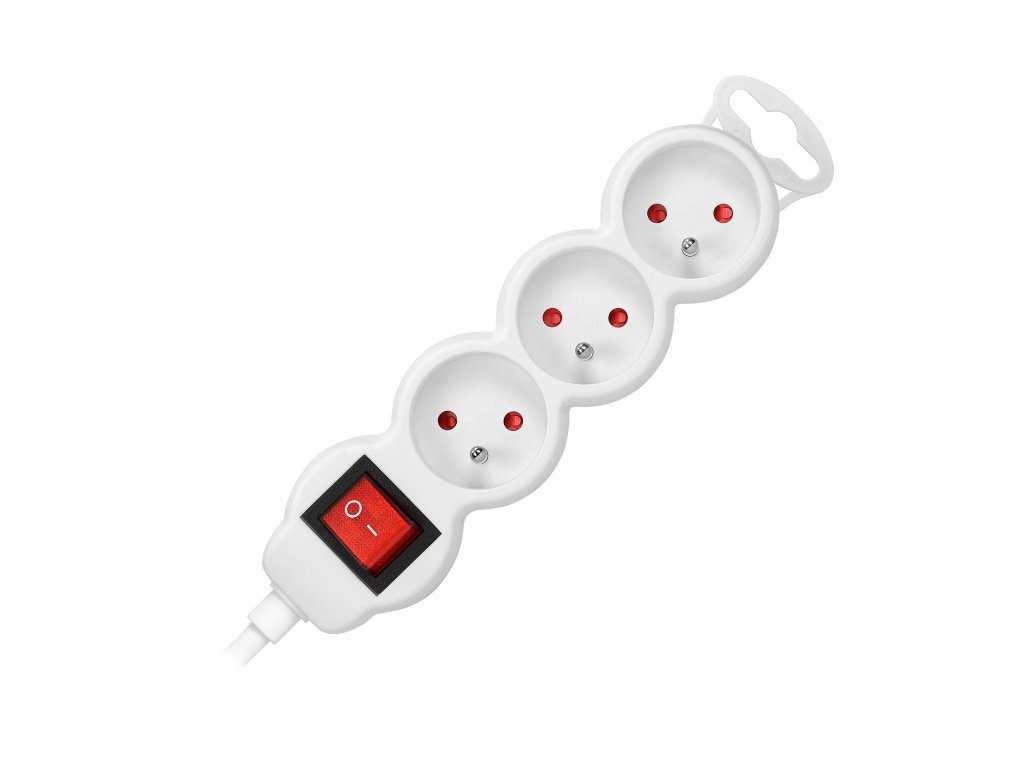 Trojzásuvková predlžovacia zásuvka je ľahko použiteľné a bezpečné riešenie pre kancelárie a domácnosti. Produkt je biely, vybavený 3 francúzskymi typmi zásuviek (2P+E), kábel H05VV-F 3x1,5 mm2 dlhý 1,4 m, plochá zástrčka s pohodlnou rukoväťou, ochranné uzávery, osvetlený dvojcestný vypínač, pohodlný vešiak, ak potrebujete zariadenie zavesiť napr. na stenu, PVC izolácia. Iba pre vnútorné použitie (IP20).