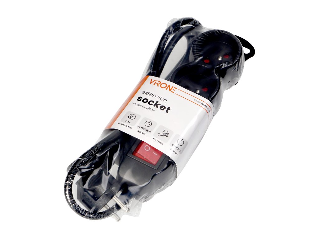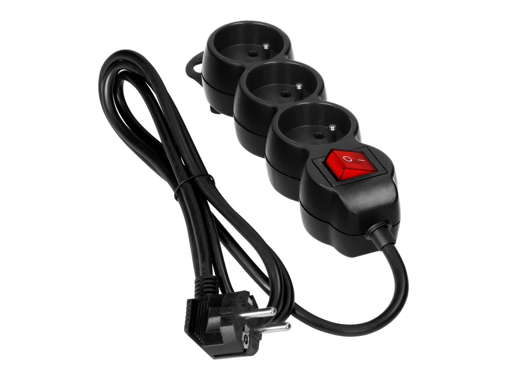 Predlžovacie zásuvky 3x2P+E, ON/OFF, 1,4m, H05VV-F, 3x1mm2, čierny
