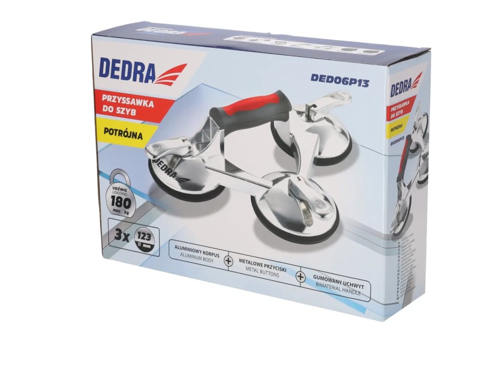 Maximálna nosnosť prísavky na zasklievanie DED06P13 je 180 kg, takže je najvhodnejšia na prepravu panelov, skiel aj veľmi veľkých rozmerov.