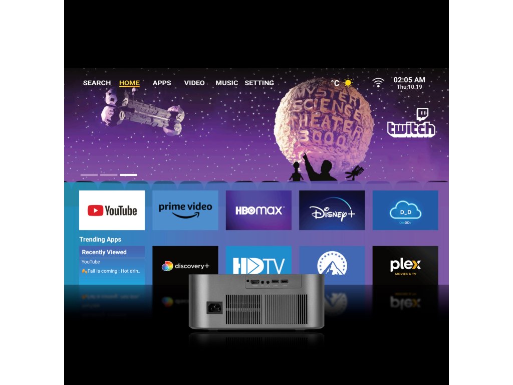 Projektor V-LED100 má širokú funkčnosť, ktorá z neho urobí inteligentnú televíziu. Vďaka Wi-Fi získate rýchlo prístup k internetu. Okrem toho sú nainštalované najobľúbenejšie aplikácie ako Netflix, Disney+ alebo Prime Video, ktoré vám umožnia sledovať vaše obľúbené filmy a seriály bez pripájania ďalších káblov!