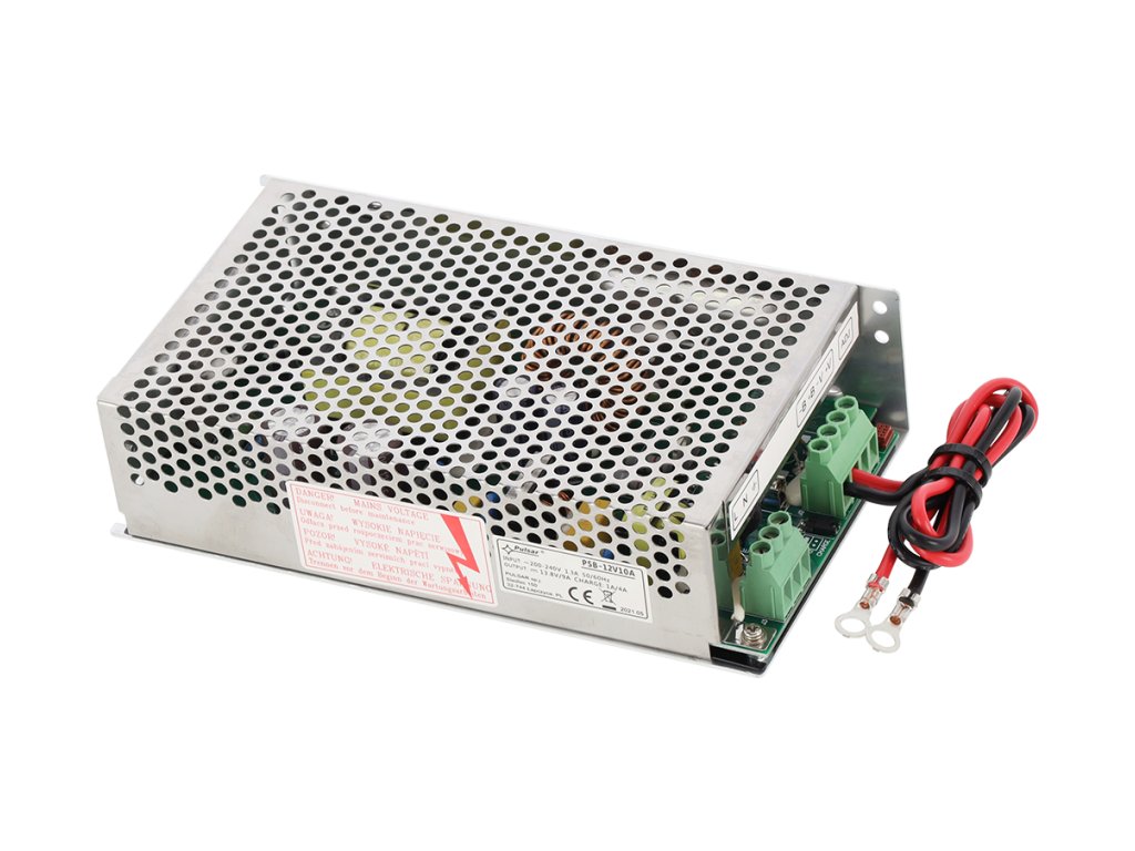 Záložný zdroj, impulzný PSB-12V10A je určený na napájanie CCTV, ako aj iných zariadení, ktoré vyžadujú stabilizované, neprerušované napätie o hodnote 12V DC (+/-15%). Napätie U=13,5 – 14 V je dodávané zariadením s prúdovou kapacitou:
