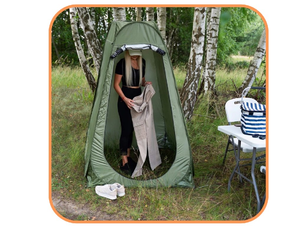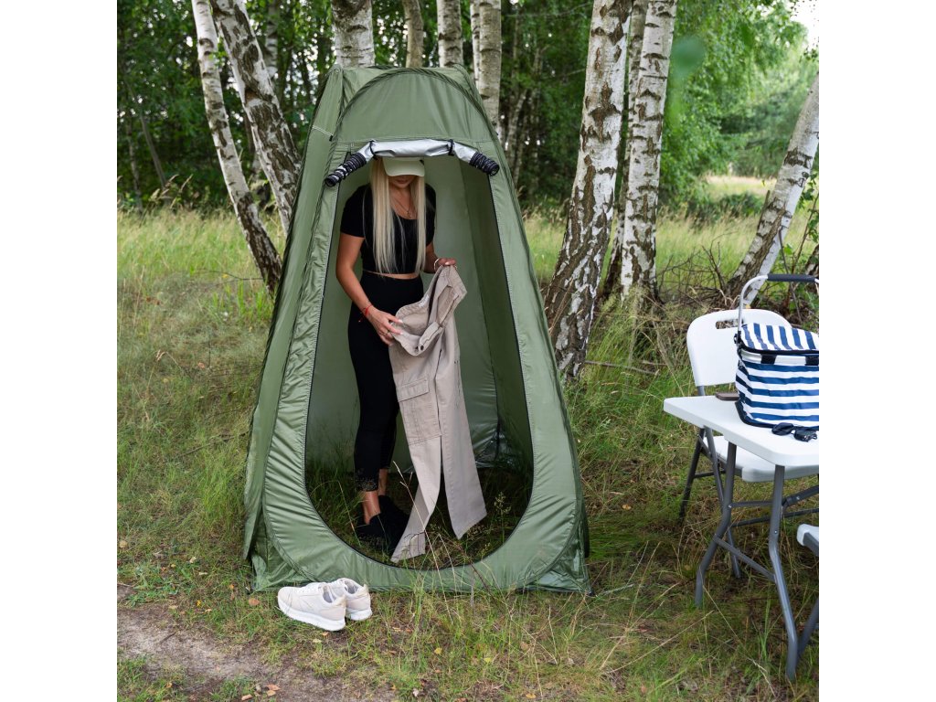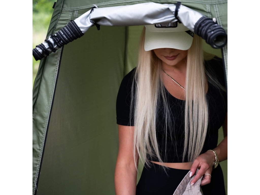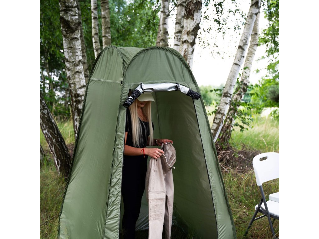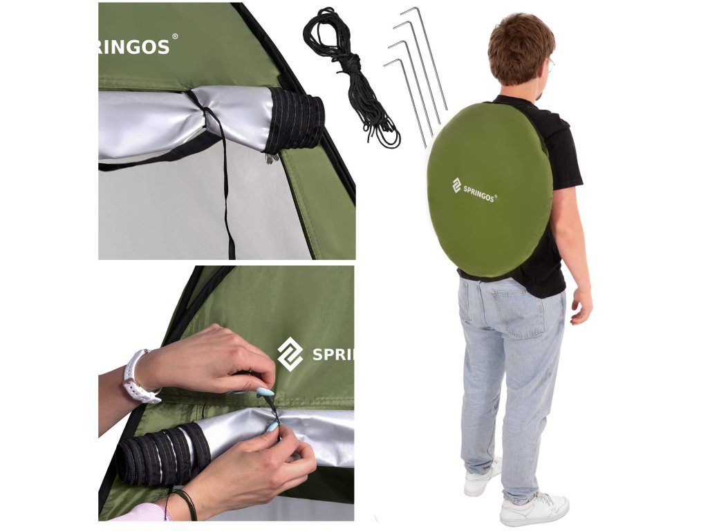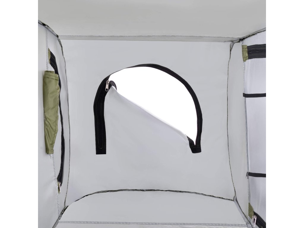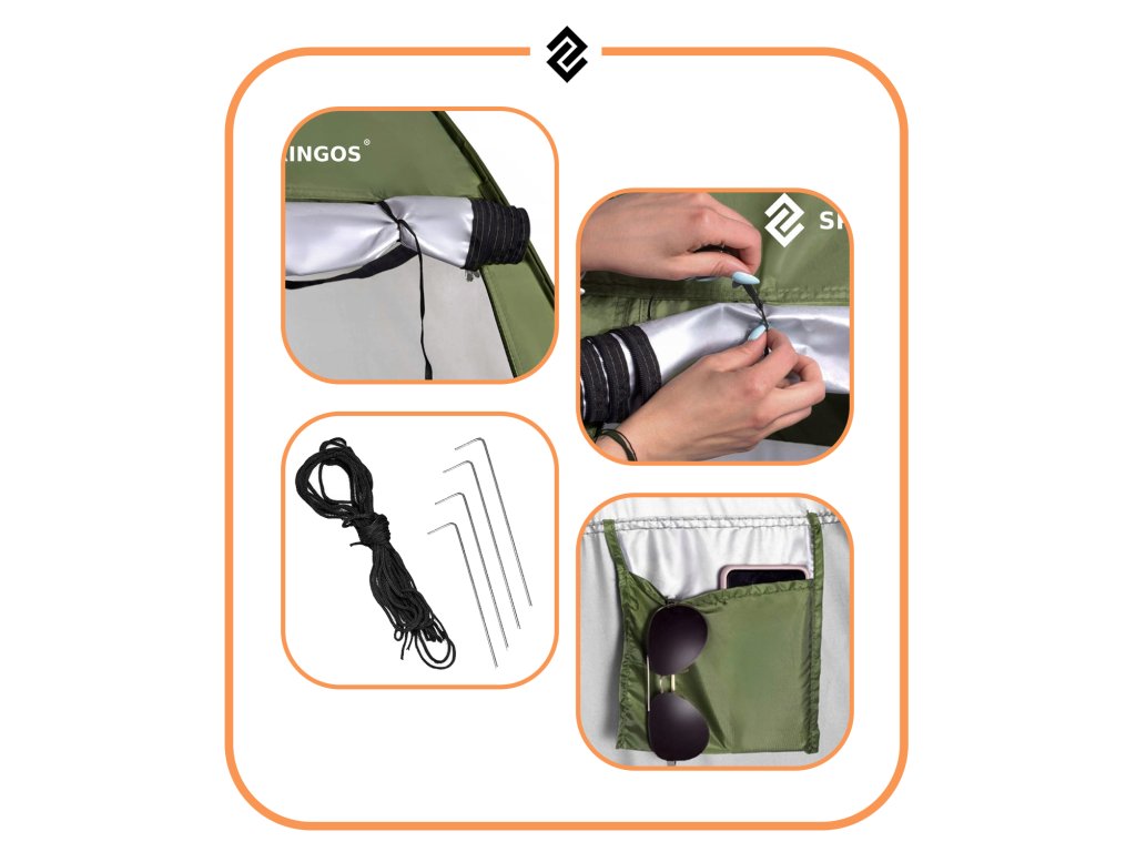 - At the top of each corner of the wall, 4 hooks through which you can thread ropes and secure the changing room to stand stable and not sway in the wind